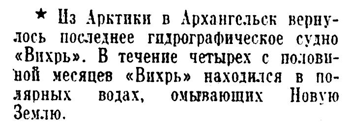 4 сентября «Вихрь» прибыл в район своих основных работ (мыс Шмидта). Путь с запада на восток был закопчен благополучно и без опозданий.