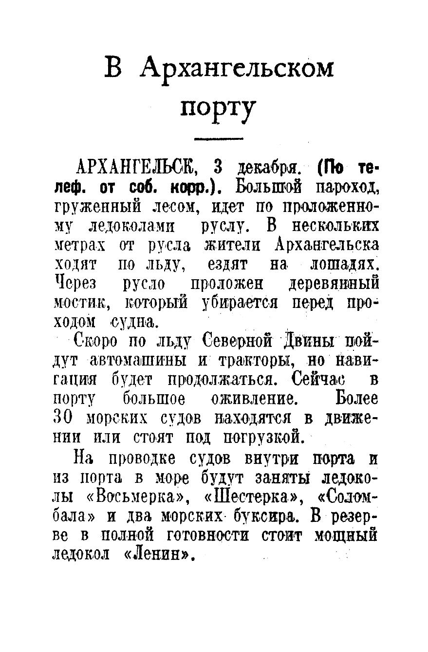 АРХАНГЕЛЬСК, 3 декабря. (По телеф. от соб. корр.). Большой пароход, груженный лесом, идет по проложенному ледоколами руслу. В нескольких метрах от русла жители Архангельска ходят по льду, ездят на лошадях. Через русло проложен деревянный мостик, который убирается перед проходом судна.