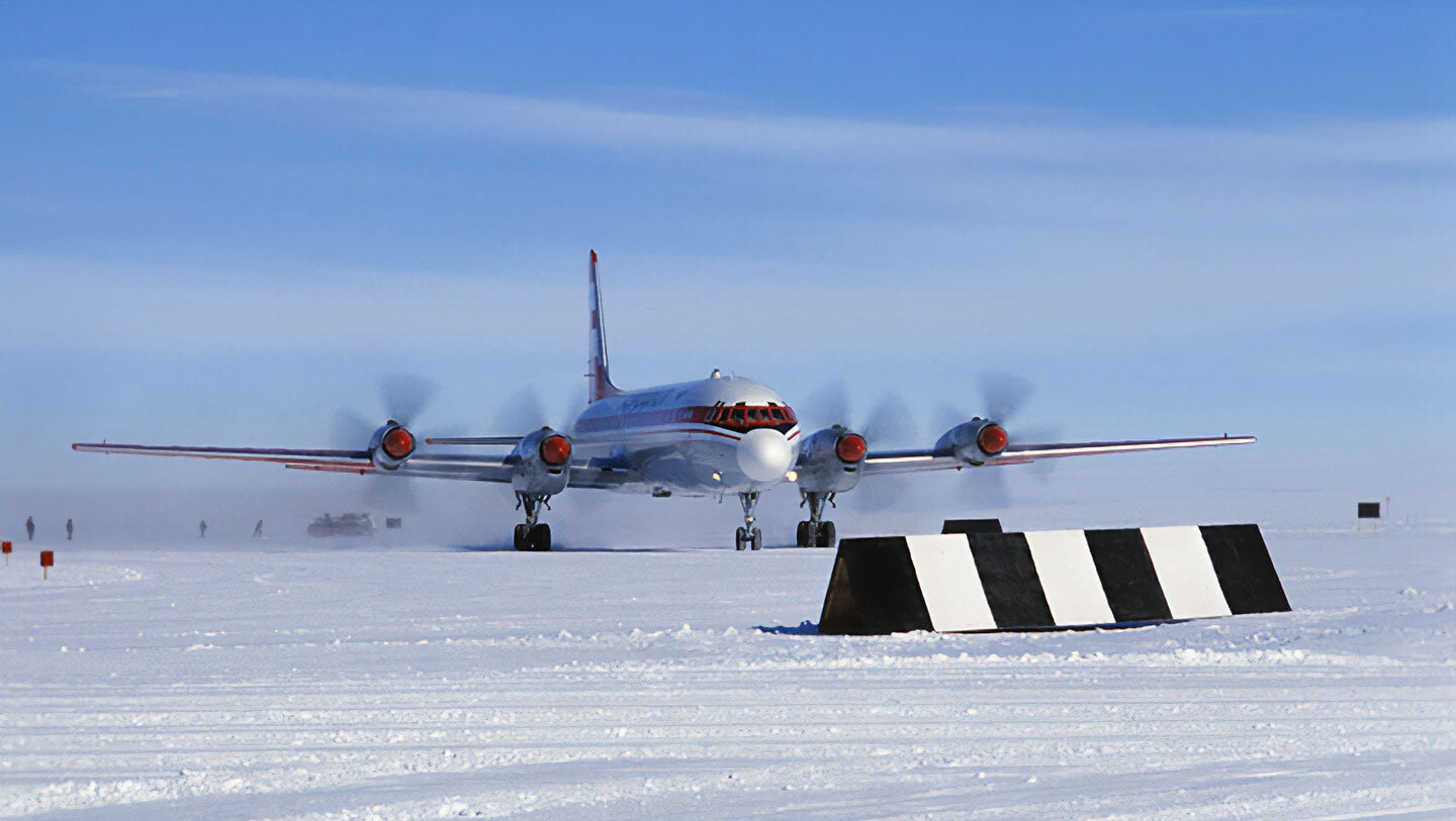 2. Самолёт Ил-18Д идёт на посадку на аэродром АМЦ «Молодёжная», завершив полет на Полюс относительной недоступности Антарктиды.