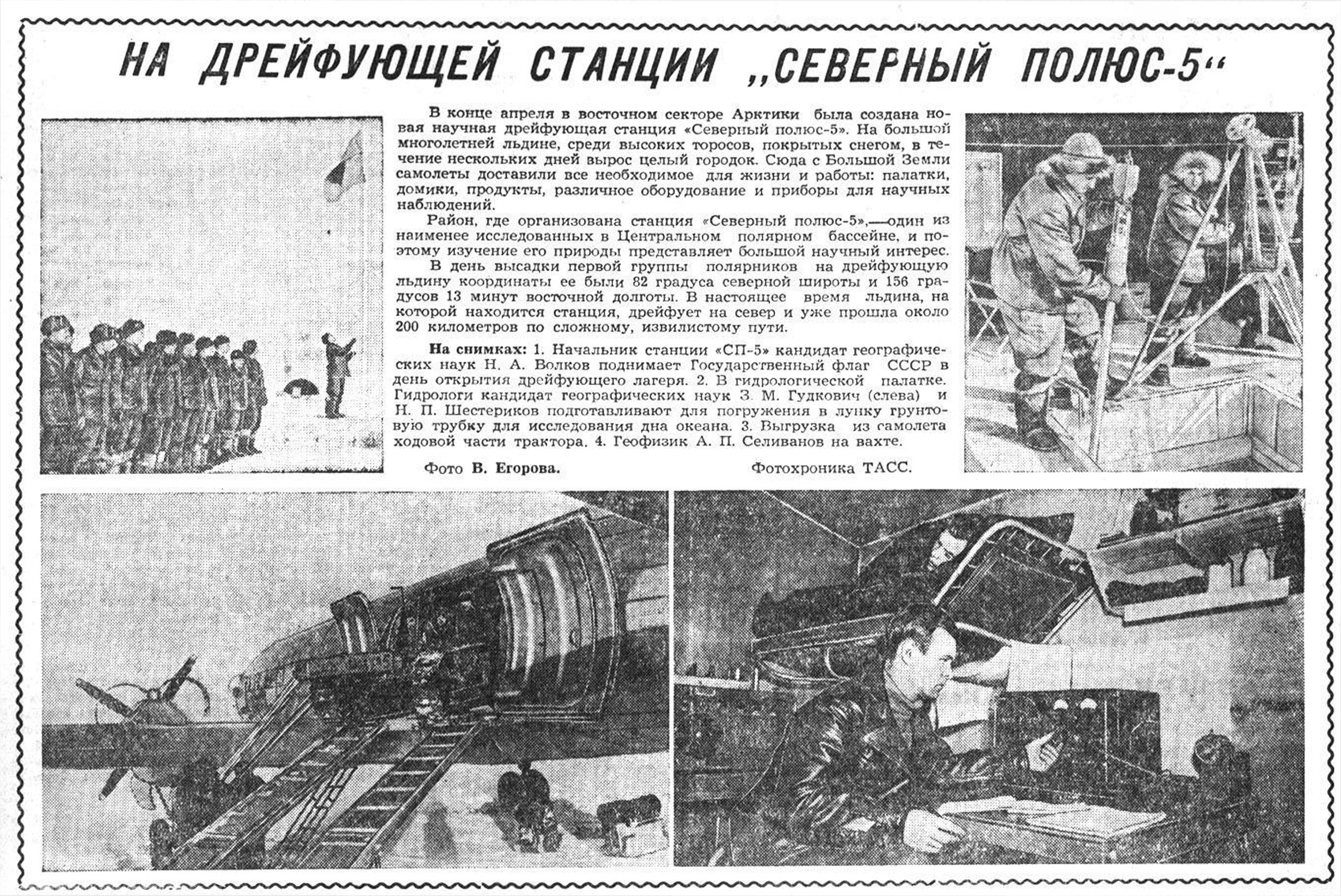 В конце апреля в восточном секторе Арктики была создана новая научная дрейфующая станция «Северный полюс-5». На большой многолетней льдине, среди высоких торосов, покрытых снегом, в течение нескольких дней вырос целый городок. Сюда с Большой Земли самолеты доставили все необходимое для жизни и работы: палатки, домики, продукты, различное оборудование и приборы для научных наблюдений.