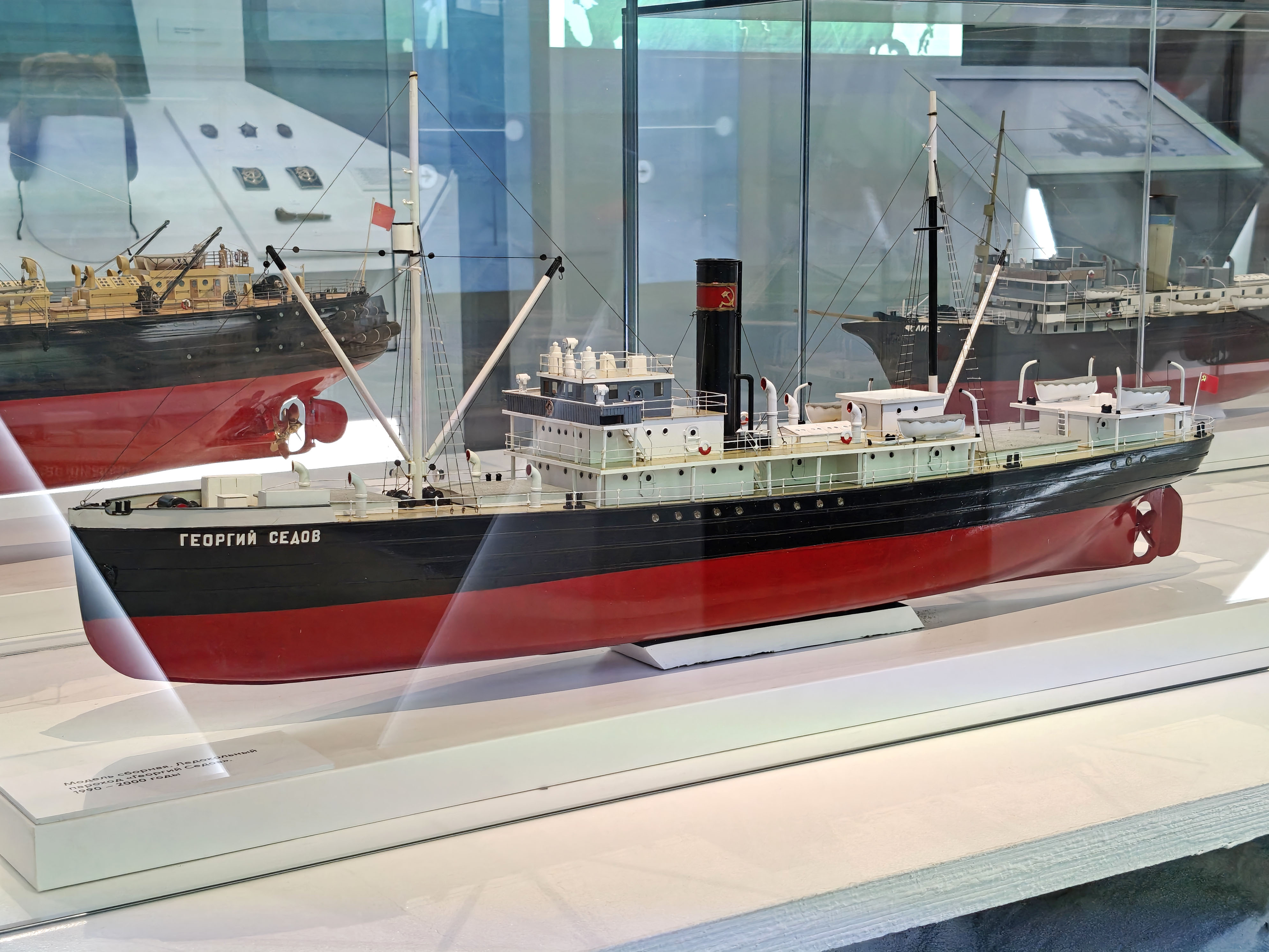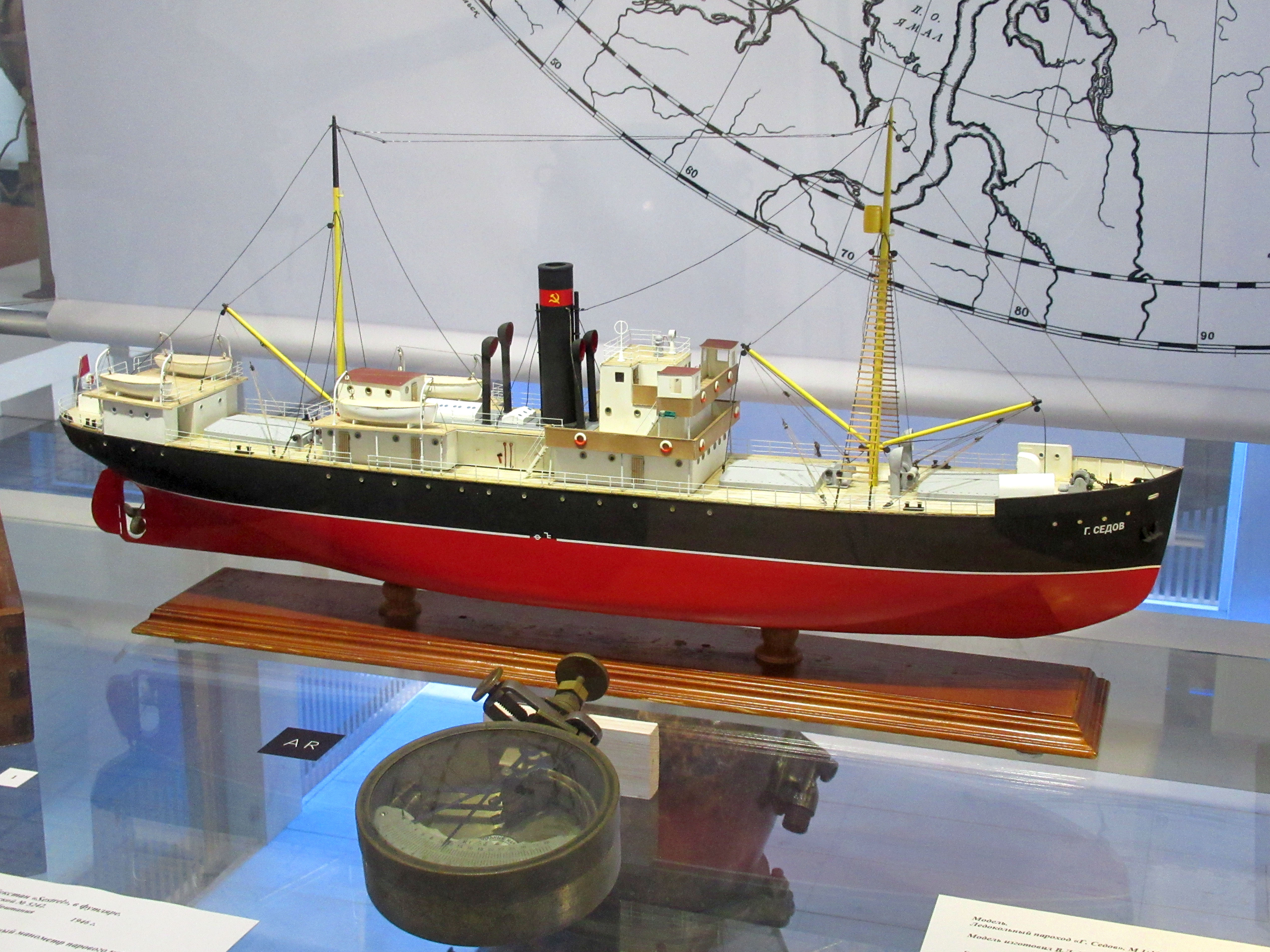 Другая модель л/п "Георгий Седов" из коллекции Мурманского областного краеведческого музея. Изготовлена в 1940 г. Размеры 175,0х40,0х25,0 см. Изображение и информация из Госкаталога.