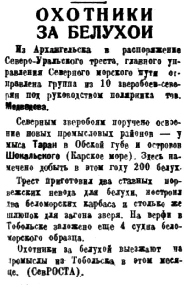 Трест приготовил два ставных норвежских невода для белухи, построил два беломорских карбаса и столько же шлюпок для загона зверя. На верфи в Тобольске заложено еще 4 судна беломорского образца.