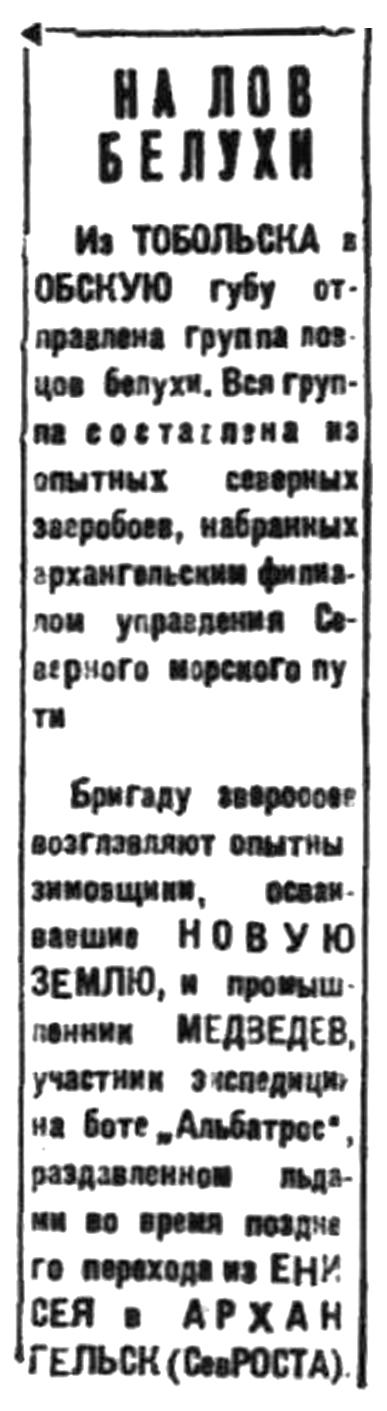 Из ТОБОЛЬСКА в ОБСКУЮ губу отправлена группа ловцов белухи. Вcя группа составлена из опытных северных зверобоев, набранных архангельским филиалом управления Северного морского пути.