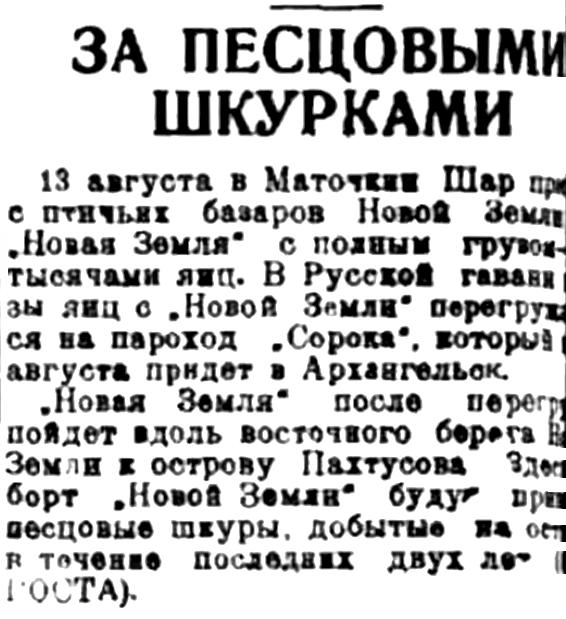 13 августа в Маточкин Шар пришел с птичьих базаров Новой Земли бот "Новая Земля" с полным грузом xx-тысячами яиц. В Русской гавани грузы яиц с "Новой 3емли" перегружаются на пароход "Сорока", который хх августа придет в Архангельск.