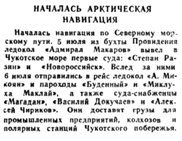 Началась навигация по Северному морскому пути. 5 июля из бухты Провидения ледокол «Адмирал Макаров» вывел в Чукотское море первые суда: «Степан Разин» и «Новороссийск». Вслед за ними 6 июля отправились в рейс ледокол «А. Микоян» и пароходы «Будённый» и «Миклуха Маклай», а также суда-снабженцы «Магадан», «Василий Докучаев» и «Алексей Чириков». Они доставят грузы для промышленных предприятий, колхозов и полярных станций Чукотского побережья.