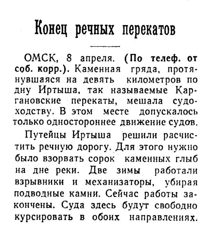 ОМСК, 8 апреля. (По телеф. от соб. корр.). Каменная гряда, протянувшаяся на девять километров по дну Иртыша, так называемые Каргановские перекаты, мешала судоходству. В этом месте допускалось только одностороннее движение судов.