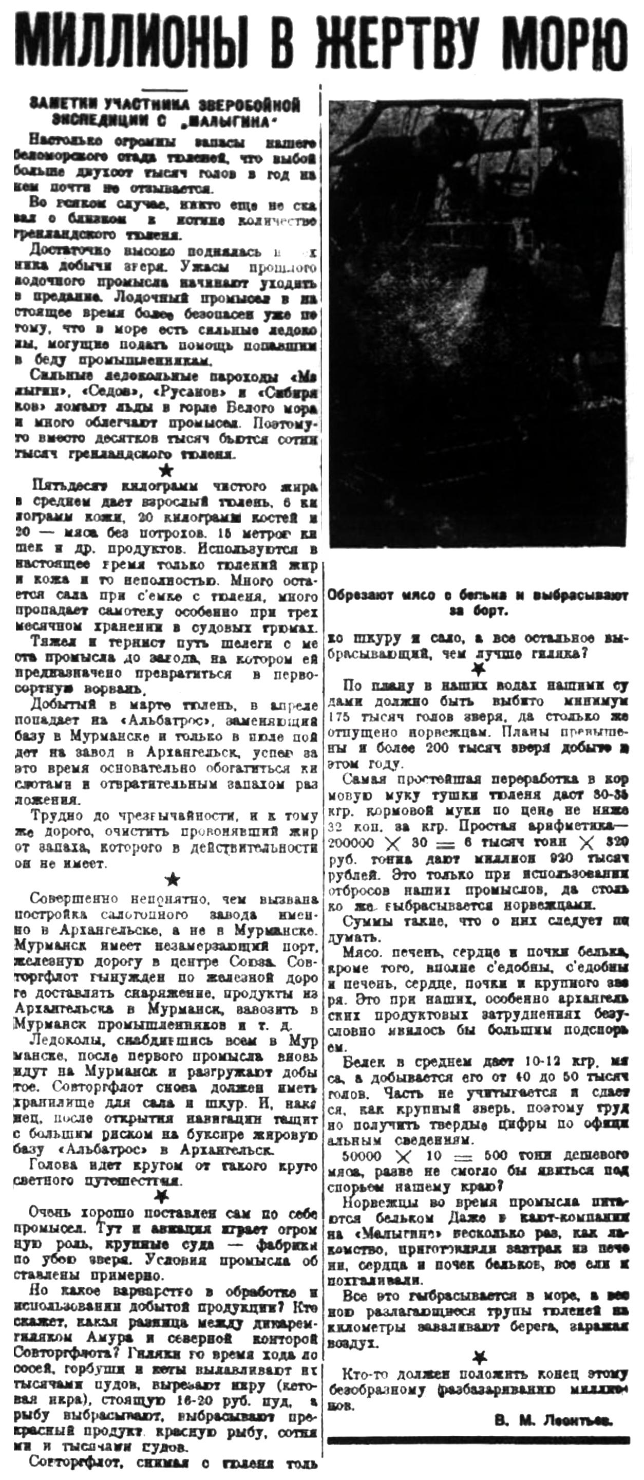 Сильные ледокольные пароходы «Малыгин», «Седов», «Русанов» и «Сибиряков» ломают льды в горле Белого мора и много облегчают промысел. Поэтому-то вместо десятков тысяч бьются сотни тысяч гренландского тюленя.