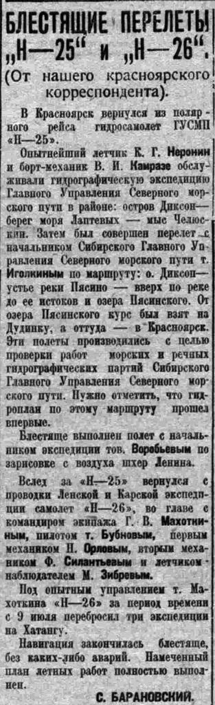 Добролет пишет:фото экспедиция по Тунгусскому метеориту Кулика 1937 В Красноярск прилетел гидросамолет Главсевморпути, оборудованный аэрофотосъемочной аппаратурой. Вылет назначили на 12 июля 1937, У таежной эвенкийской Вановары при посадке на Подкаменную Тунгуску потерпел аварию гидроплан "Н-31". К счастью, экипаж и пассажиры: Л.А. Кулик и аэросъемщик С.В. Петров остались живы. Но аэросъемка оказалась сорванной.