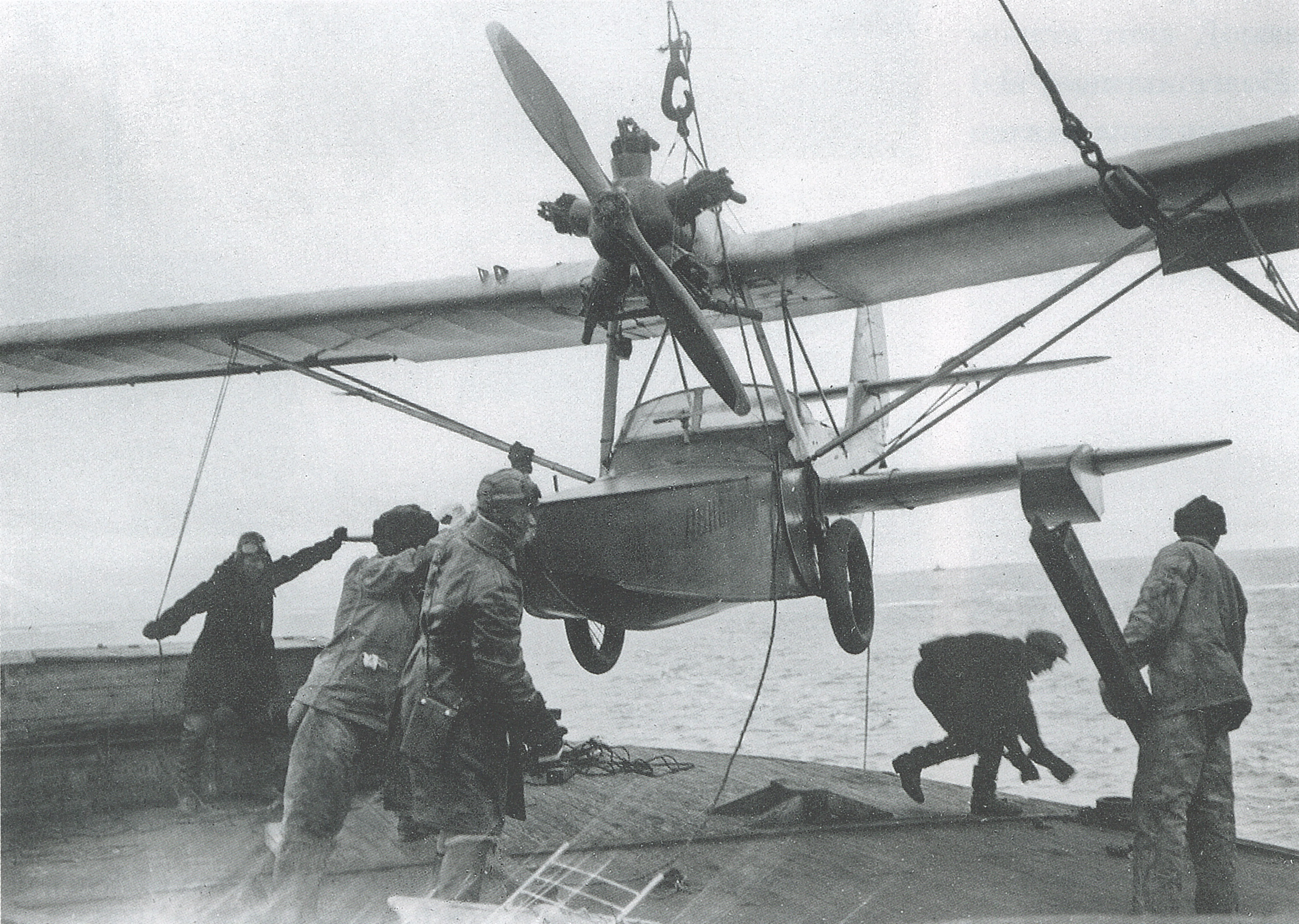 Ш-2 с надписью «Авиаарктика» на носу опускают бортовым краном с палубы на воду
