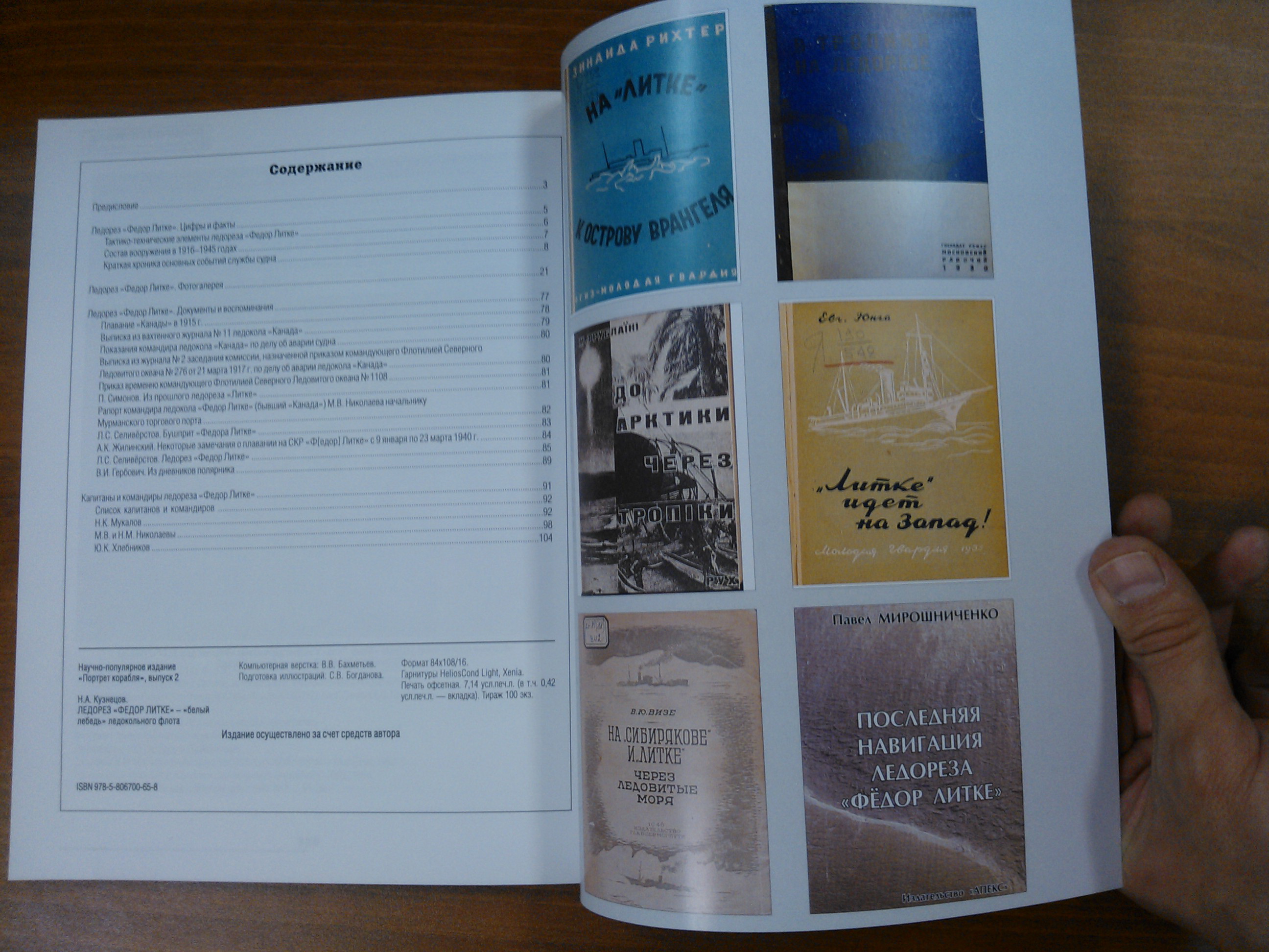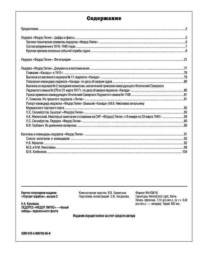55 страниц книги отведено фотографиям, значительная часть которых публикуется впервые. На страницах издания читатель сможет ознакомиться с хроникой основных собы¬тий истории судна, ранее неизвестными документами и воспоминаниями и биографическими статьями о некоторых капитанах ледореза (Н.К. Мукалове, М.В. и Н.М. Николаевых и Ю.К. Хлебникове).