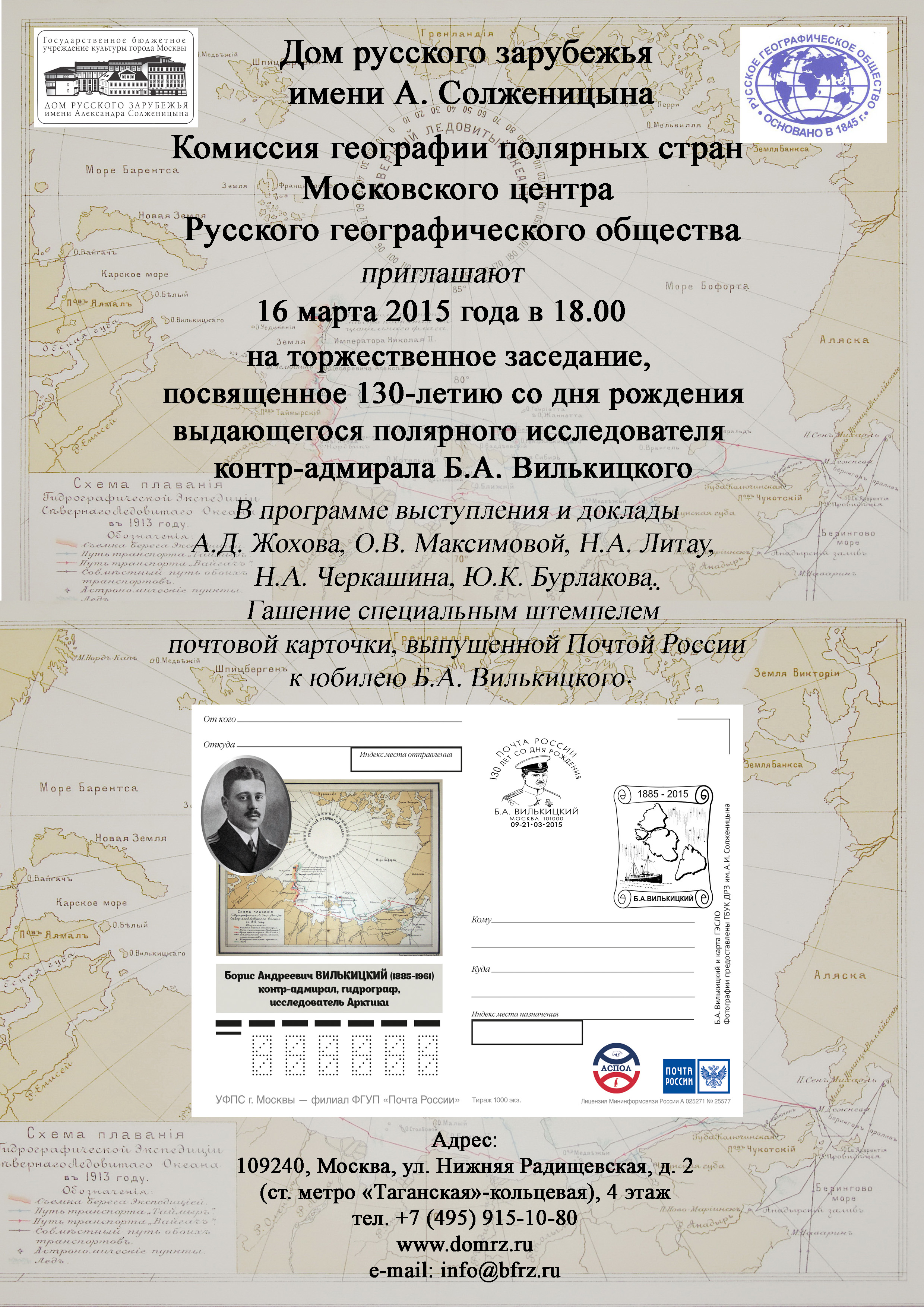 16 марта в большом зале Дома русского зарубежья им. А.И.Солженицына состоится заседание комиссии географии полярных стран Московского городского отделения Русского географического общества, посвященное 130-летию со дня рождения Б.А.Вилькицкого.