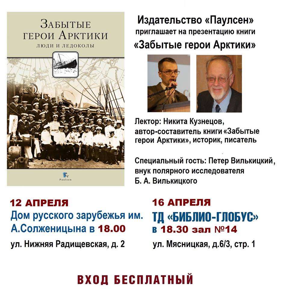 12 апреля в Доме русского зарубежья им. А.С.Солженицыев и 16 апреля в торговом доме "Библио-Глобус" состоится представление книг Н.В.Вилькицкой "Воспоминания о великой русской революции"и Н.А.Кузнецова "Забытые герои Арктики. Люди и ледоколы". В мероприятиях принимают участие внук Б.А.Вилькицкого Петер Вилькицкий и автор книги Н.А.Кузнецов.
