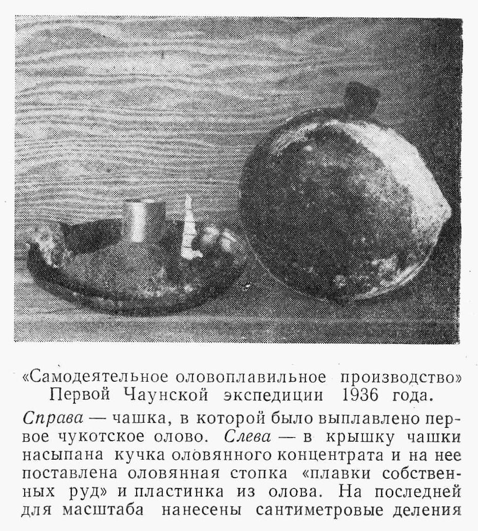 ... Новый, 1937 год всем нам хотелось отметить чем-нибудь знаменательным, связанным с нашей работой. Возможности у нас были скромные, но мы их все-таки решили использовать. Надробили руды с Валькумея, отмыли от нее шлих (концентрат, касситерита), приготовили шихту, то есть добавили к концентрату толченого древесного угля и соды, все засыпали в чашку с крышкой — это несложное «сооружение» мы выбили из днища железной бочки. Затем поместили чашку в раскаленную печь, которая находилась в нашей столовой, предварительно загрузив эту печь каменным углем. Дверцу плотно закрыли. В общем получилась восстановительная атмосфера, необходимая для выплавки олова из концентрата касситерита. После трехчасовой «экспозиции» чашку вытащили и остудили. Когда выбили из нее продукты плавки, на дне под слоем затвердевшего шлака лежала плитка металлического олова весом более ста граммов.