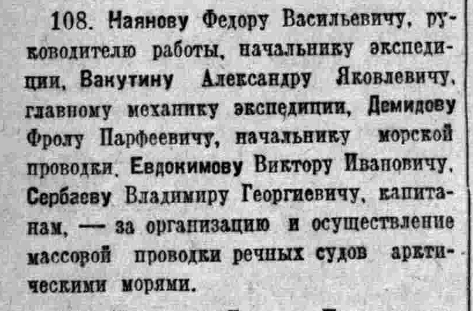 108. Наянову Федору Васильевичу, руководителю работы, начальнику экспедиции, Вакутину Александру Яковлевичу, главному механику экспедиции, Демидову Фролу Парфеевичу, начальнику морской проводки, Евдокимову Виктору Ивановичу, Сербаеву Владимиру Георгиевичу, капитанам, — за организацию и осуществление массовой проводки речных судов арктическими морями.