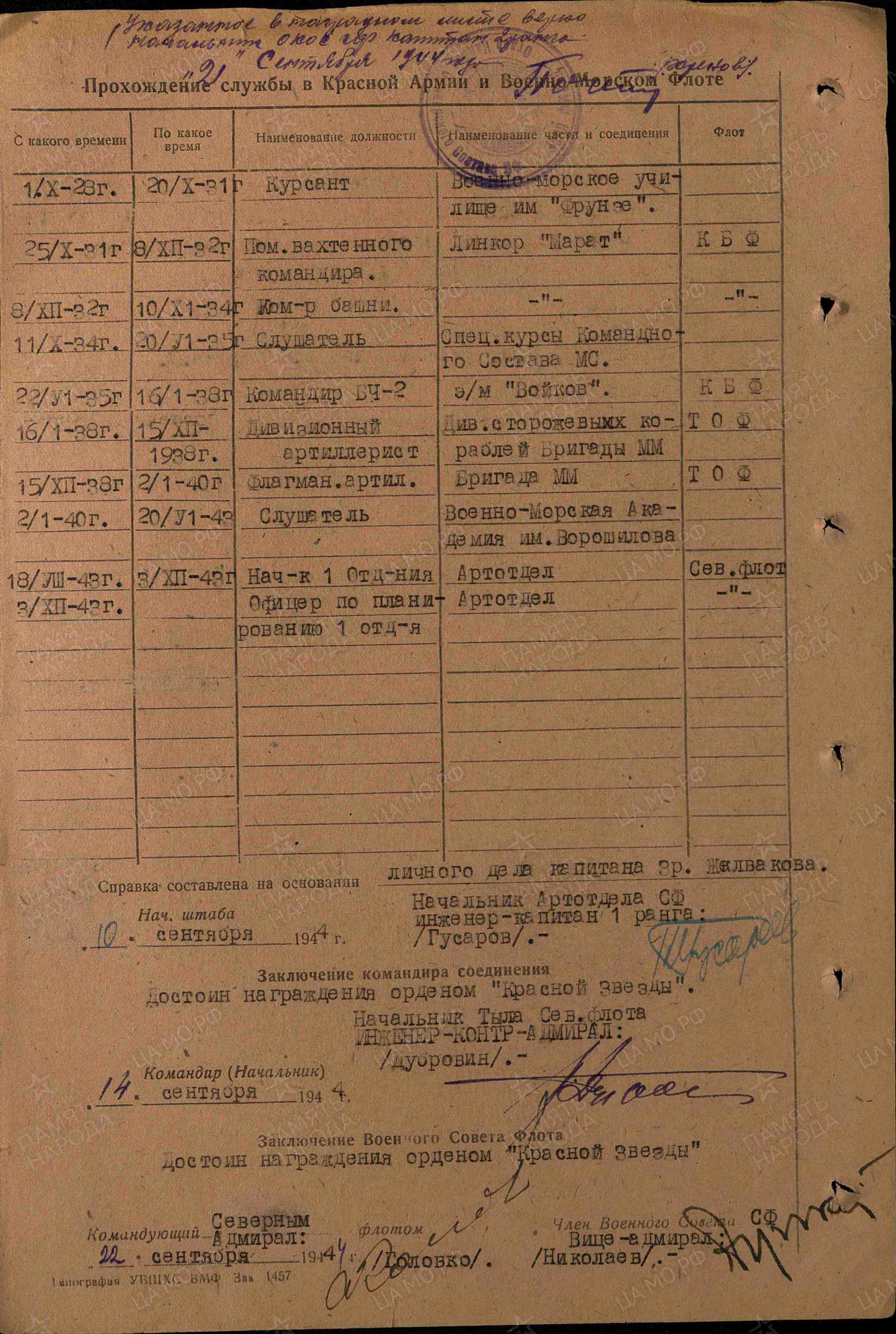 http://tsushima.su/forums/viewtopic.php ... 1#p100070129 мая Командующий КБФ флагман флота 2 ранга Галлер Л.М. заслушал доклад командира ЭОН-3 по командному составу назначенных к переходу миноносцев. Капитан 1 ранга Евдокимов просил заменить помощника командира старшего лейтенанта Григорьева И. Г., артиллериста старшеголейтенанта Гашунина Н. И. и командира машинной группы Татеосова А. Т. (все с ЭМ «Сталин»), а на «Войкове» списать командира машинной группы Долбина и вместо него назначить Соколова. В документе, с которым я знакомился в архиве, причины появления такой просьбы не отмечены. Мне же удалось несколько проясить ситуацию только с Григорьевым И. Г.: помощник командира ЭМ «Сталин» старший лейтенант Григорьев Иван Германович, 1908 г. рождения, беспартийный, в РККА с 1927, уволен в запас приказом НКО СССР № 2187 от 14 мая 1937 г. «за контрреволюционную агитацию против советской власти и партии». Стало понятно, почему этот однокашник С. Г. Горшкова (оба окончили ВМУ 23.02.1931 г.) так и остался старшим лейтенантом. На «Сталин» Григорьев пришёл с линкора «Марат», а до этого служил минёром на «Сталинце» и учился в подводном классе УОПП ВМС (отчислен).