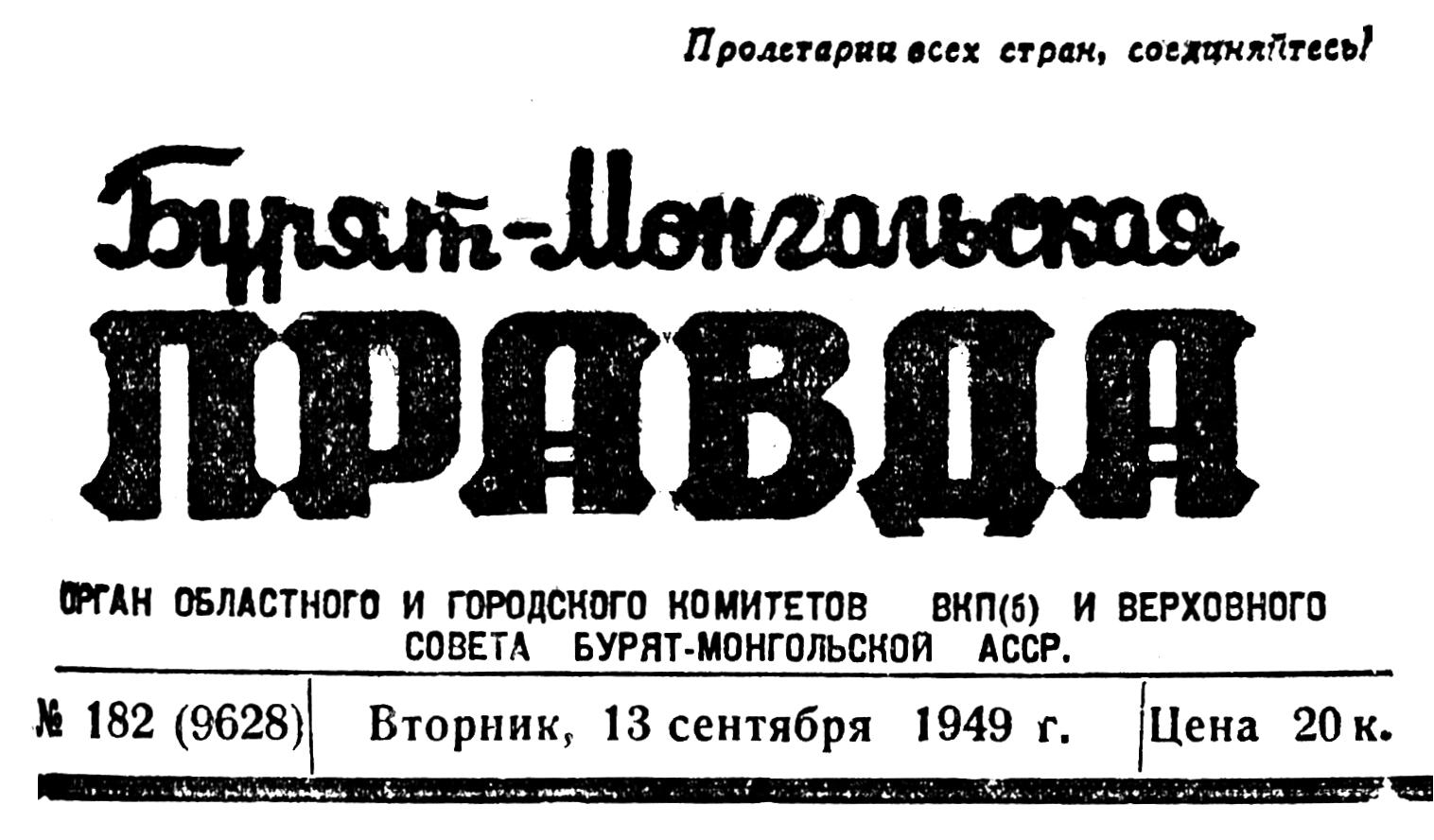 Бурят-Монгольская правда, № 182 (9628).Вторник 13 сентября 1949 г.