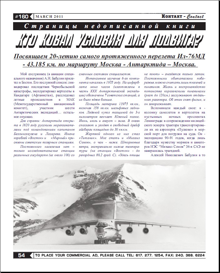 А. Бабулин. "Кто ковал условия для подвига. Посвящаем 20-летию самого протяженного перелета Ил-76МД - 43,185 км. по маршруту Москва - Антарктида - Москва."