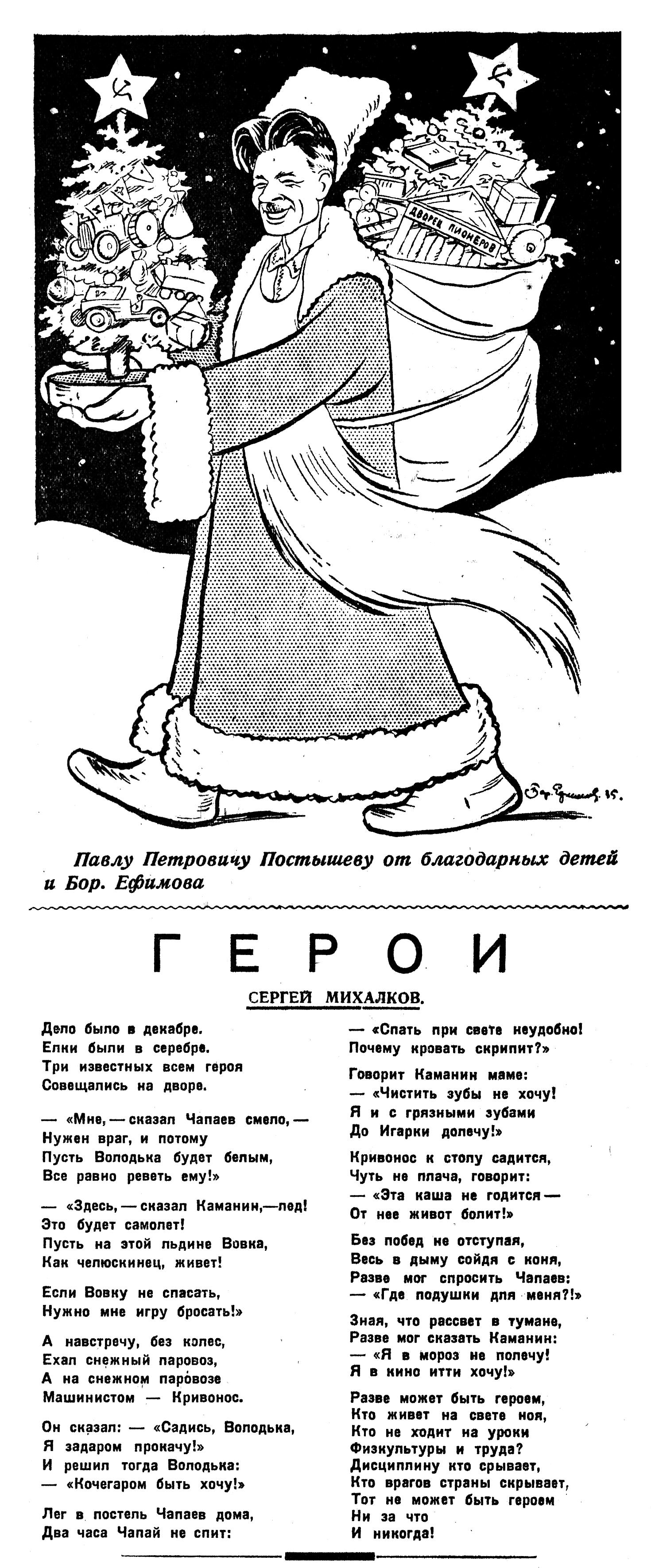 быть детская елка! Не должно быть ни одного колхоза, где бы правление вместе с комсомольцами не устроило бы накануне нового года елку для своих ребятишек. Горсоветы, председатели районных исполкомов, сельсоветы, органы народного образования должны помочь устройству советской елки для детей нашей великой социалистической родины.