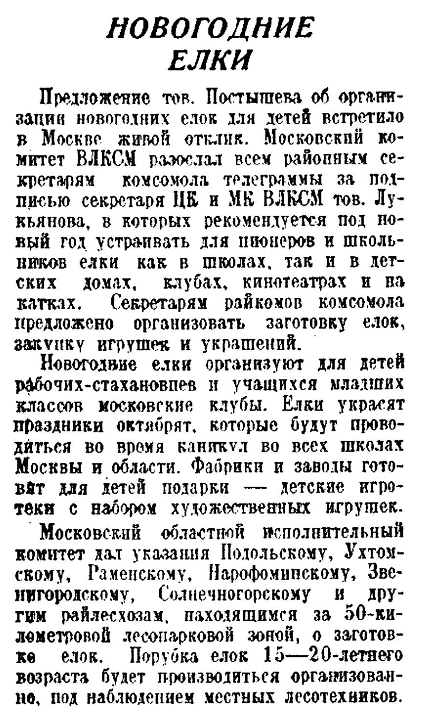 Предложение тов. Постышева об организации новогодних елок для детей встретило в Москве живой отклик. Московский комитет ВЛКСМ разослал всем районным секретарям комсомола телеграммы за подписью секретаря ЦК и МК ВЛКСМ тов. Лукьянова, в которых рекомендуется под новый год устраивать для пионеров и школьников елки как в школах, так и в детских домах, клубах, кинотеатрах и на катках. Секретарям райкомов комсомола предложено организовать заготовку елок, закупку игрушек и украшений.