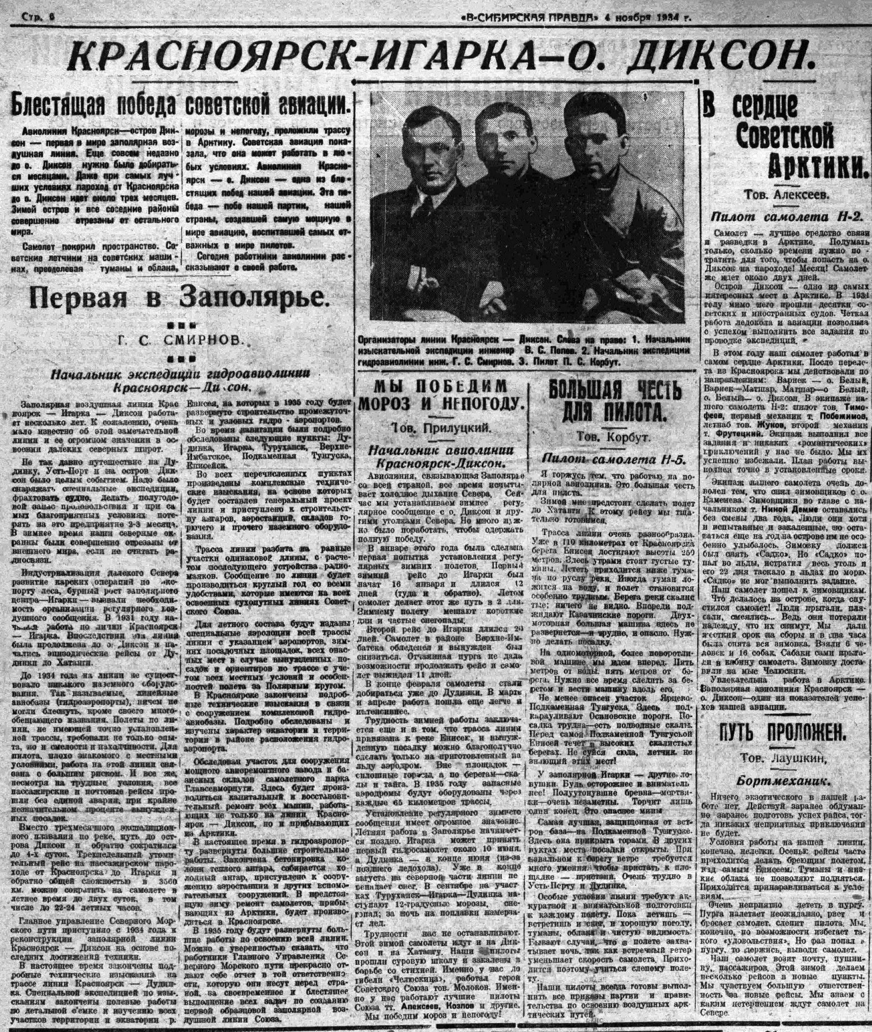 Самолет покорил пространство. Советские летчики на советских машинах, преодолевая туманы и облака, морозы и непогоду, проложили трассу в Арктику. Советская авиация показала, что она может работать в любых условиях. Авиалиния — Красноярск — о. Диксон — одна из блестящих побед нашей авиации. Эта победа — победа нашей партии, нашей страны, создавшей самум мощную в мире авиацию, воспитавшей самых отважных в мире пилотов.