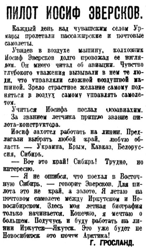 Увидев в воздухе машину, колхозник Иосиф Эверсков долго провожал ее взглядом. Он много читал об авиации. Чувство глубокого уважения вызывали в нем те люди, что управляли сложной воздушной машиной. Зрело страстное желание самому подняться в воздух самому управлять самолетом.