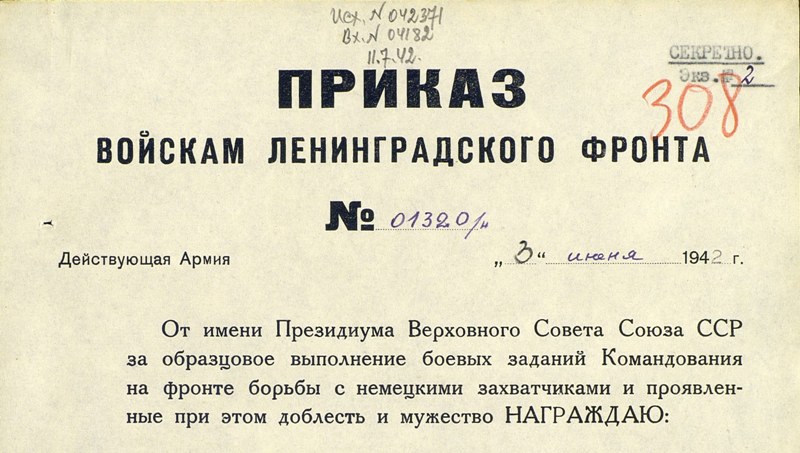 Фронтовой приказ № 1320/н от 03.06.1942 ВС Ленинградского фронта