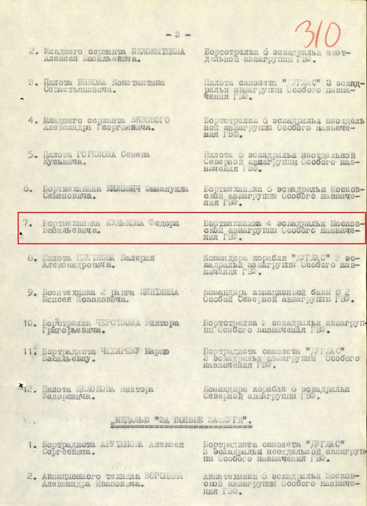 Тов. Кульков Федор Васильевич работает в 4 эскадр.особого назначения с 24 августа с. г. За время работы показал себя как хороший, примерный работник. С первых дней Великой Отечественной войны тов. Кульков сначала осваивает материальную часть ПС-84, а затем вступает в ряды 4 эскадрильи. Совершил несколько ответственных рейсов по выполнению заданий Генерального Штаба Красной Армии летая в прифронтовую полосу и в отрезанный фашистами Ленинград. Всего за время войны тов. Кульков налетал 261 час. перевез всего боеприпасов и paзных грузов военного значения 38 тонн, пассажиров и бойцов 740 чел. Красноармейских писем и печати 9 тонн. В том числе в октябре и ноябре совершил в Ленинград и обратно по 30 рейсов налетав 165 часов. Доставил в Ленинград 20 тонн боеприпасов, 44 тонны [?]. Вывез из Ленинграда 500 пассажиров и бойцов и 10 тонн грузов военного значения.