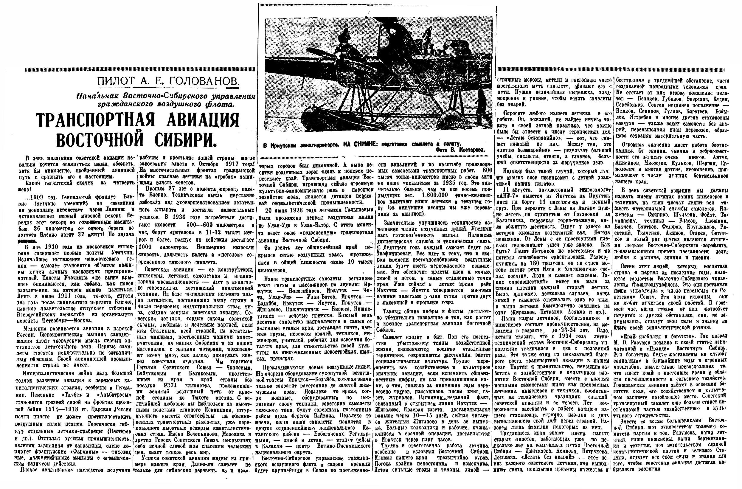Под непосредственным руководством начальника гражданского аэрофлота, Героя Советского Союза т. Молокова, наш воздушный флот растет и будет бурно расти, обслуживая народное хозяйство Сибири.