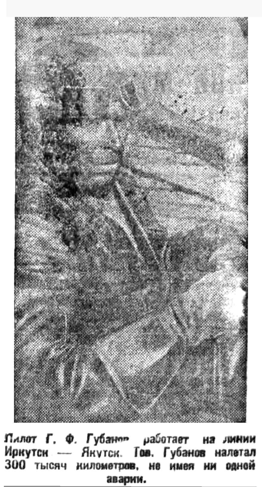 Пилот Г. Ф. Губанов работает на линии Иркутск — Якутск. Тов. Губанов налетал 300 тысяч километров, не имея ни одной аварии.