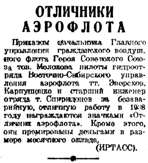 Приказом начальника Главного управления гражданского воздушного флота Героя Советского Союза тов. Молокова пилоты гидроотряда Восточно-Сибирского управления аэрофлота тт. Эверсков, Карпушенко и старший инженер отряда т. Спиридонов за безаварийную, отличную работу в 1938 году награждаются значками «Отличник аэрофлота». Кроме этого, они премированы деньгами в размере месячного оклада.