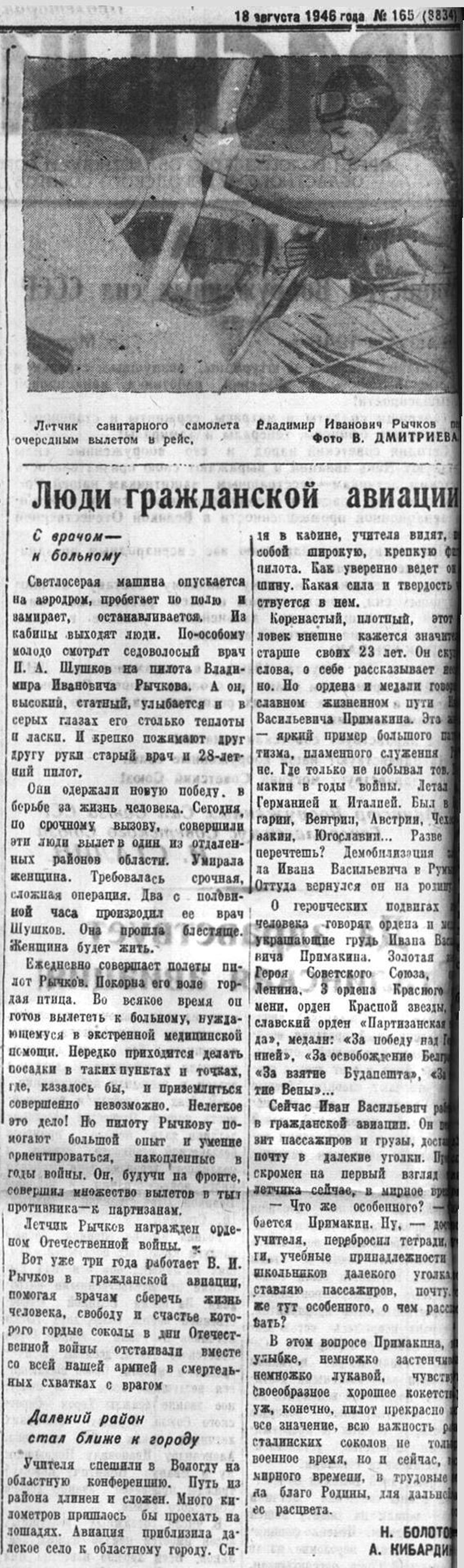 Летчик Рычков награжден орденом Отечественной войны. Вот уже три года работает В. И. Рычков в гражданской авиации, помогая врачам сберечь жизнь человека, свободу и счастье которого гордые соколы в дни Отечественной воины отстаивали вместе со всей нашей армией в смертельных схватках с врагом.