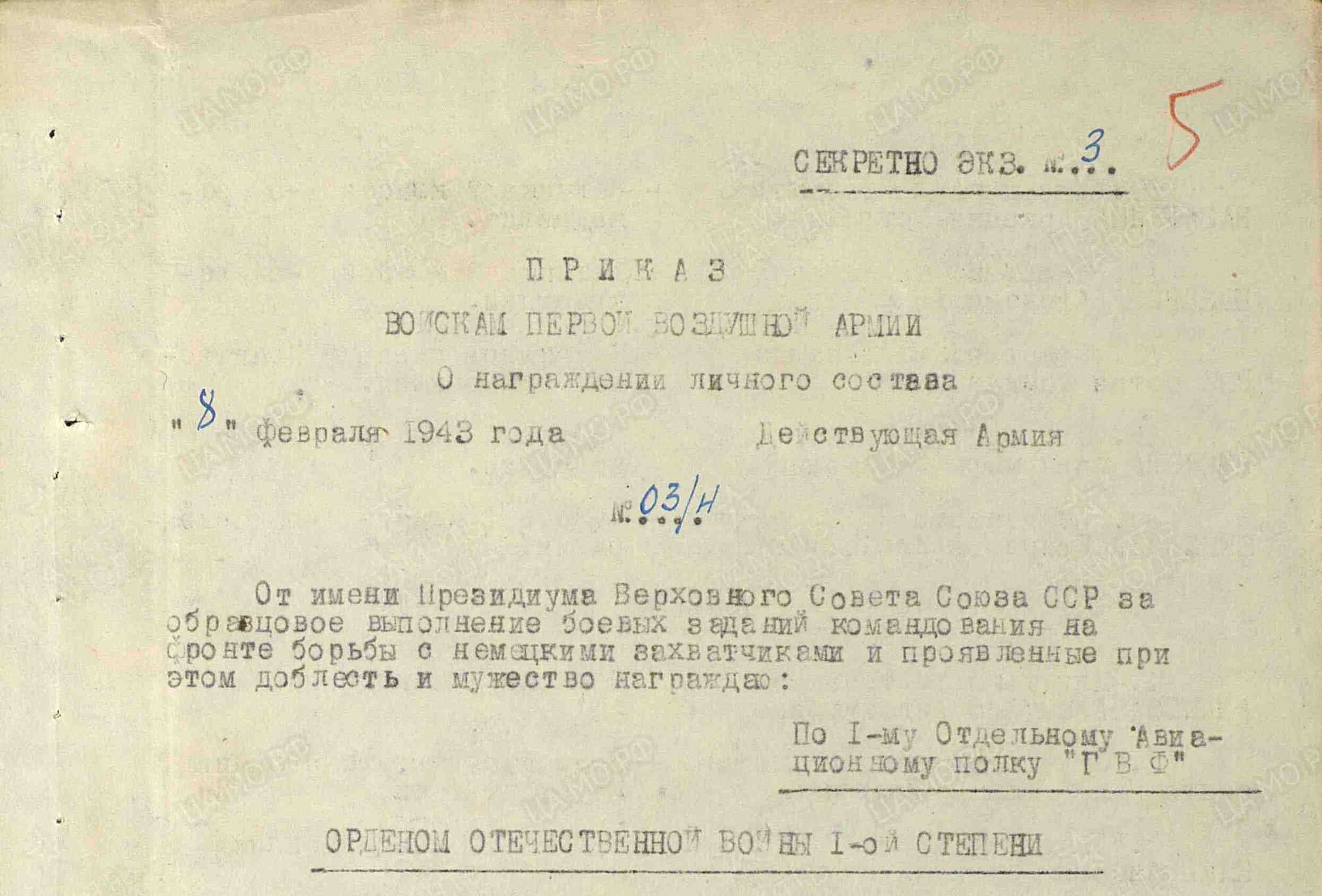 Фронтовой приказ № 3/н от 08.02.1943 ВС 1 ВА Западного фронта