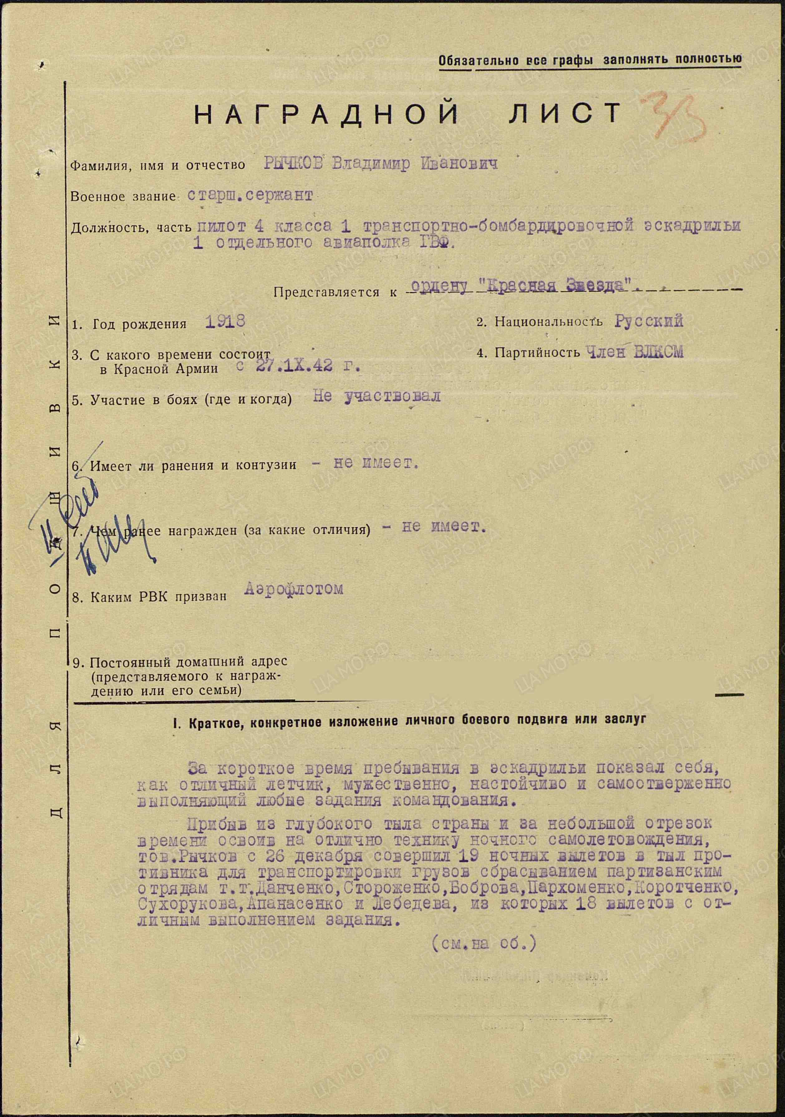 пилоту Рычкову помогают большой опыт и умение ориентироваться, накопленные в годы войны. Он, будучи на фронте, совершил множество вылетов в тыл противника—к партизанам. Летчик Рычков награжден орденом Отечественной войны.
