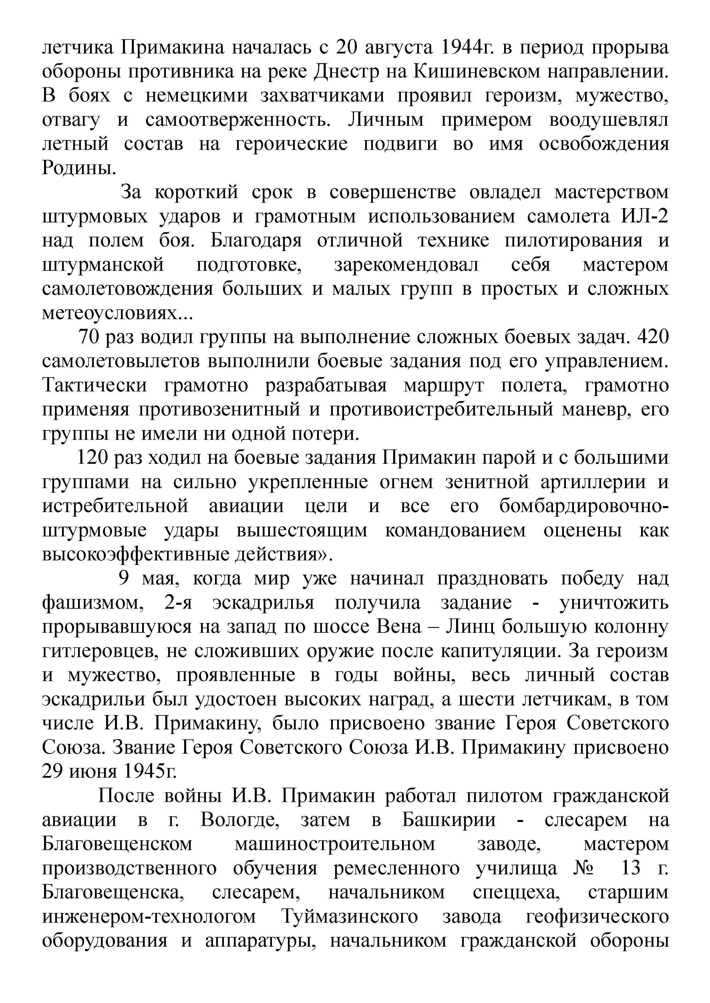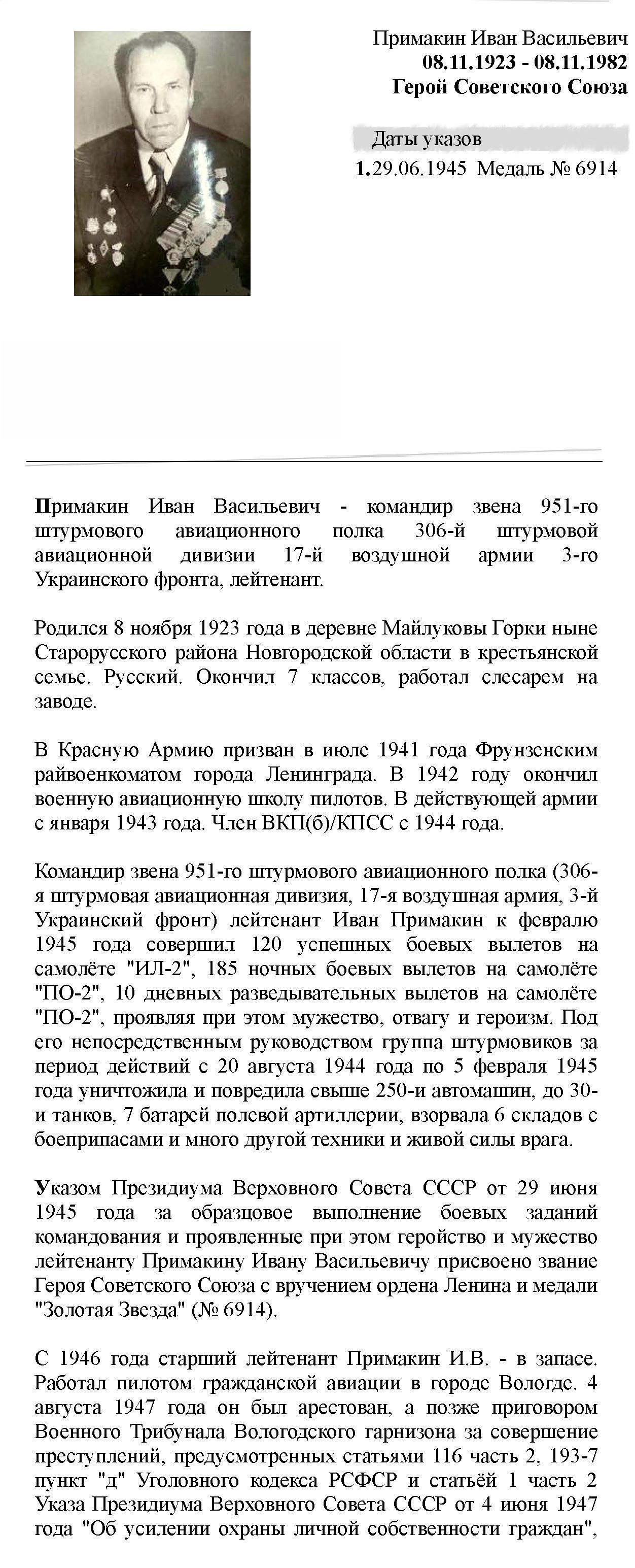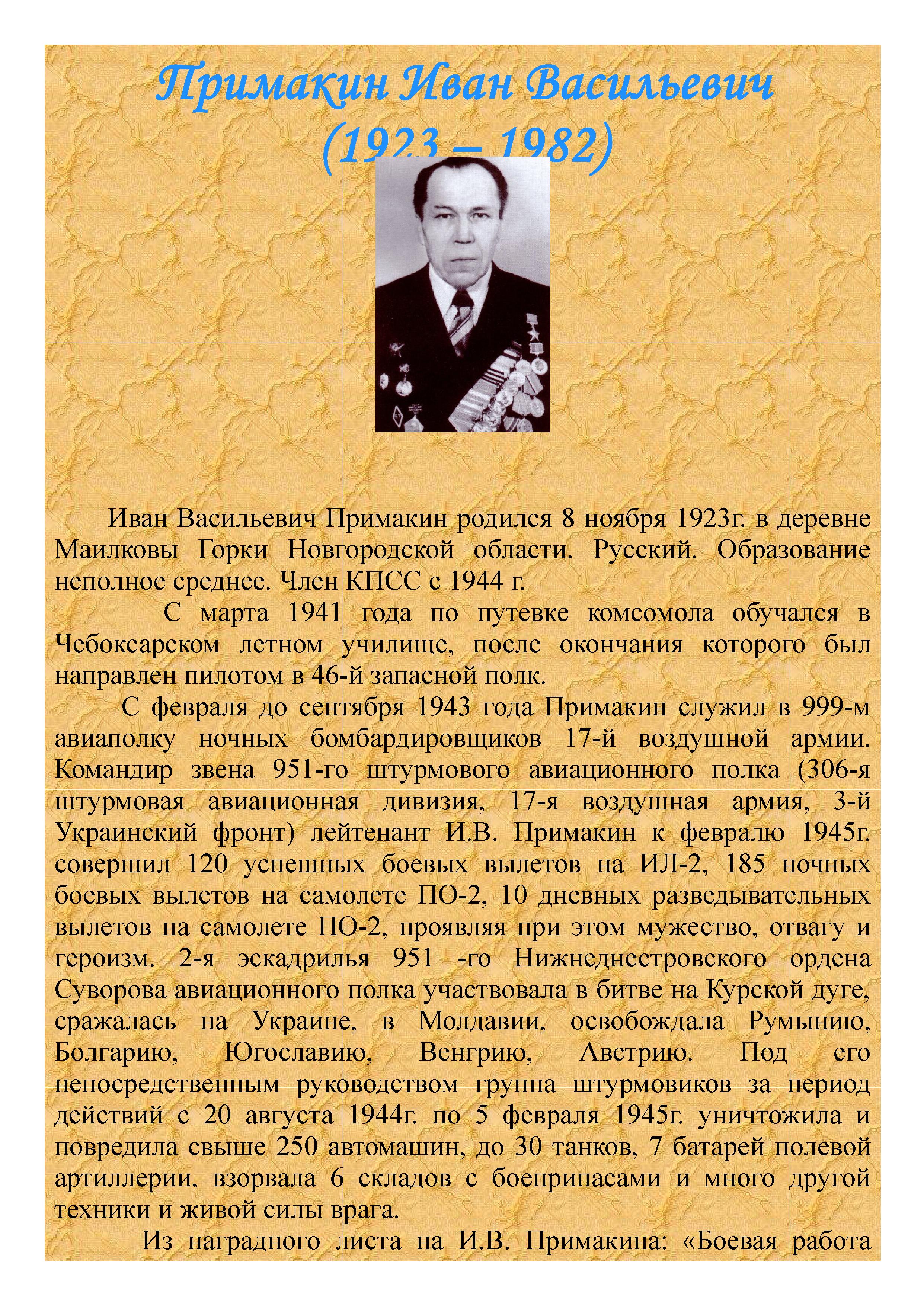 Коренастый, плотный, этот человек внешне кажется значительно старше своих 23 лет. Он скуп на слова, о себе рассказывает немногословно. Но ордена и медали говорят о славном жизненном пути Ивана Васильевича Примакина. Это живой — яркий пример большого патриотизма, пламенного служения Родине. Где только но побывал тов. Примакин в годы войны. Летал над Германией и Италией. Был в Болгарии, Венгрии, Австрии, Чехословакии, Югославии... Разве все перечтешь? Демобилизация застала Ивана Васильевича в Pyмынии. Оттуда вернулся он на poдину.