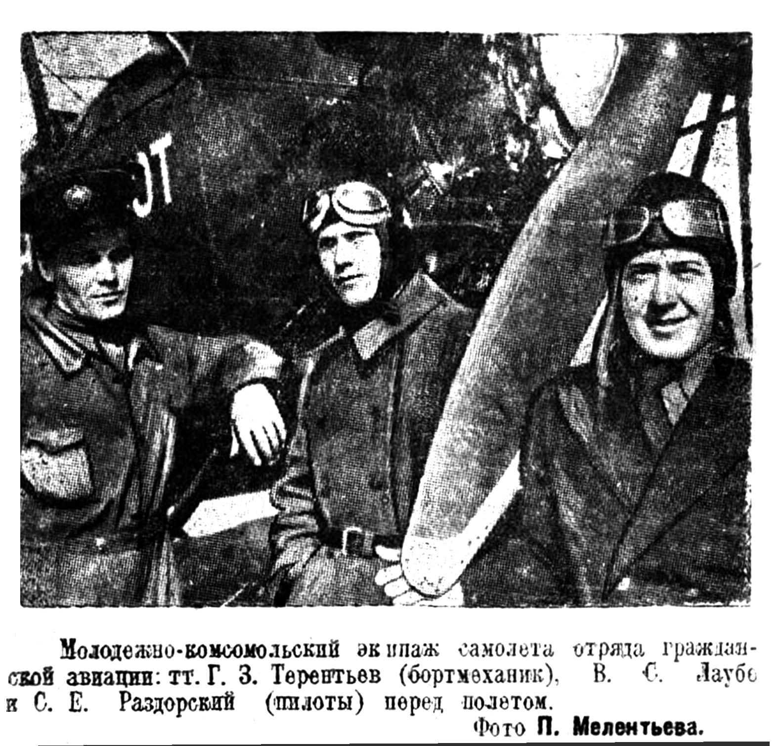 Молодёжно-комсомольский экипаж самолета отряда гражданской авиации: тт. Г. 3. Терентьев (бортмеханик), В. С. Лаубе и С. Е. Раздорский (пилоты) перед полетом.