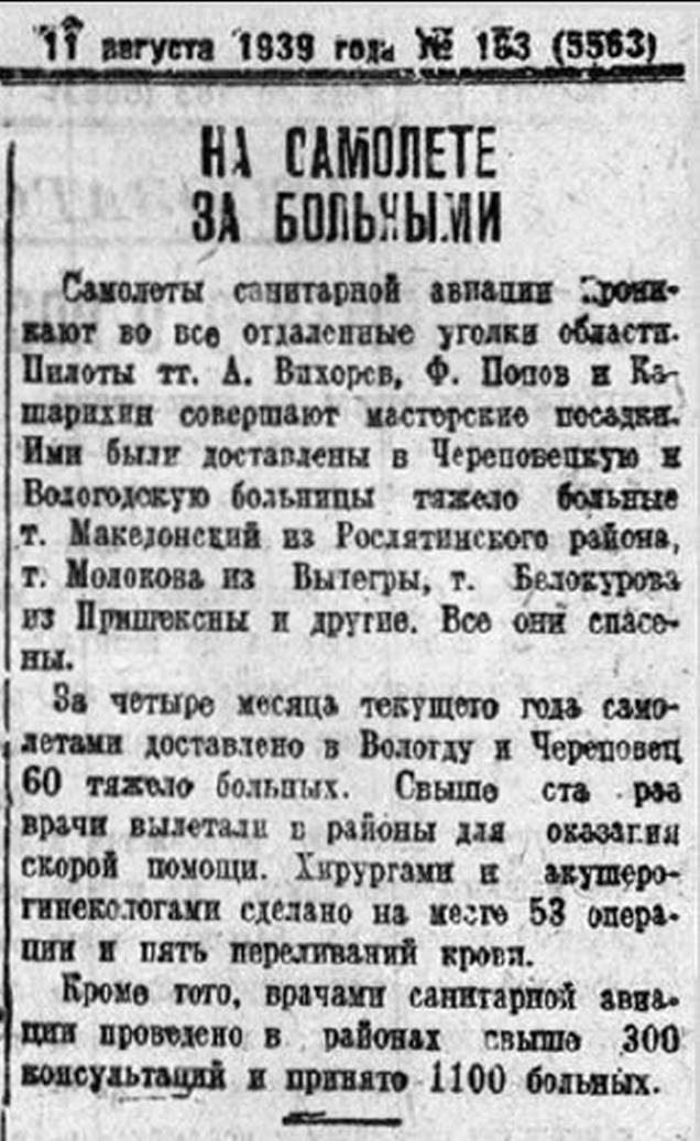 Самолеты санитарной авиации проникают во все отдаленные уголки области. Пилоты тт. А. Вихорев, Ф. Попов и Кашарихин совершают мастерские посадки. Ими были доставлены в Череповецкую и Вологодскую больницы тяжело больные т. Македонский из Рослятинского района, т. Молокова из Вытегры, т. Белокурова из Пришексны и другие. Все они спасены.