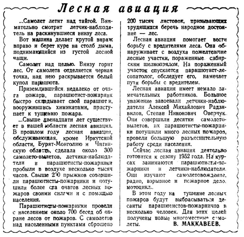 Организовав ряд новых подразделений, которые обслуживают, главным образом, северные районы Бурят-Монгольской республики, Читинской и Иркутской областей. Открыто более десяти новых линий. Тяжелые таежные условия, неизученность трассы, высокогорные местности — все это составляет дополнительные трудности в работе гражданского воздушного флота Восточной Сибири, и, несмотря на это, личный состав успешно выполняет государственные планы. План первого полугодия I950 года выполнен досрочно, 3 июня, на 101 проц. Дано более шести миллионов рублей сверхплановых накоплений.