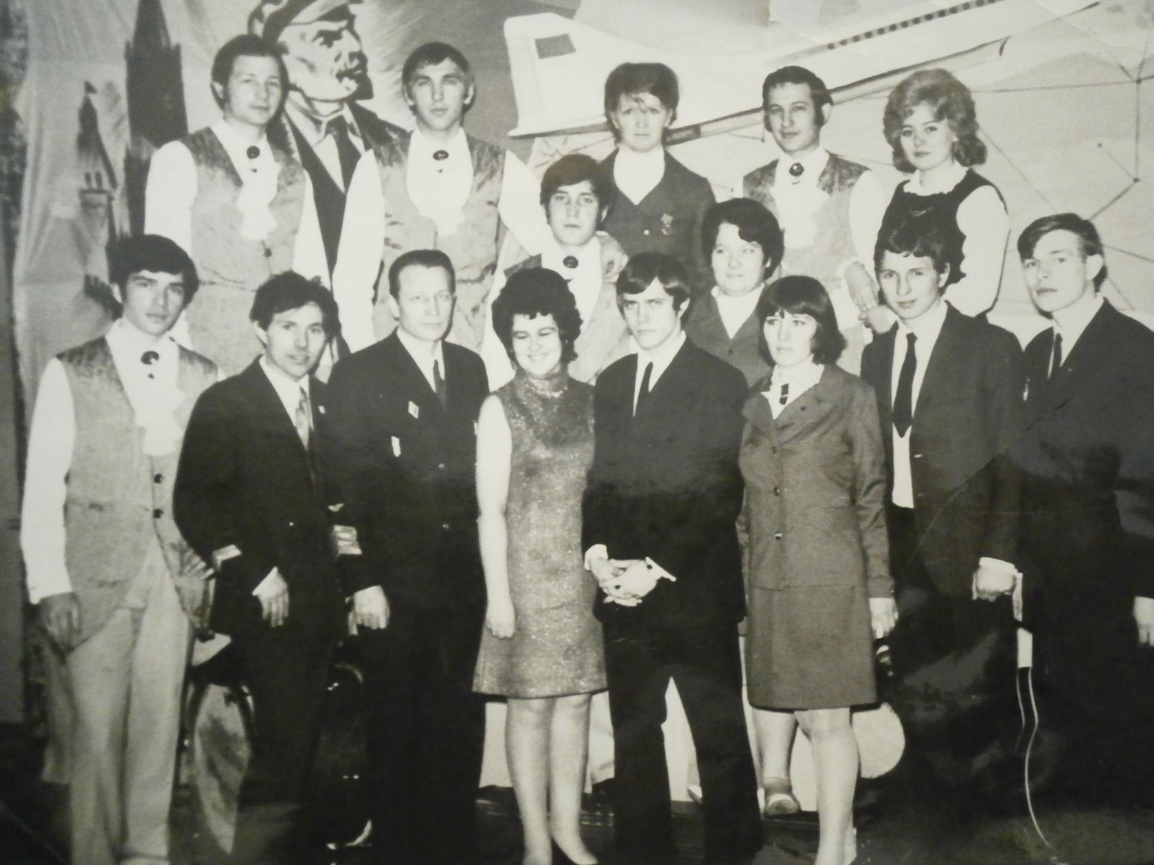 1974 г. Состав бюро РК ВЛКСМ Аллайховского района, (верхний ряд). Владимир Хаустович - АТБ ЧОАЭ, Любовь Ермакова - Радиобюро ЧОАЭ. Из архива Маргариты Ахновской, "Одноклассники"