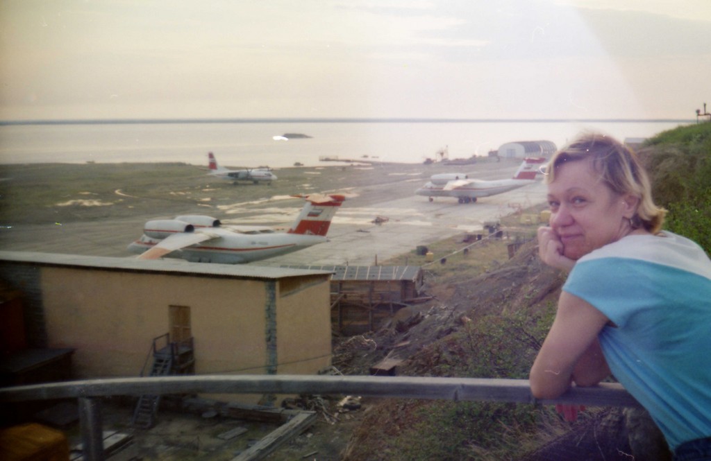 К сожалению, снимки сделаны простейшей мыльницей, разрешение аховое - прочитать номера бортов невозможно. Т.к. снимки сделаны одновременно, а в Черском в то время базировались борта 74000, 74001 и 74003, то это именно они. Один борт на стоянке регламентов около здания АТБ и два борта на перронной стоянке.