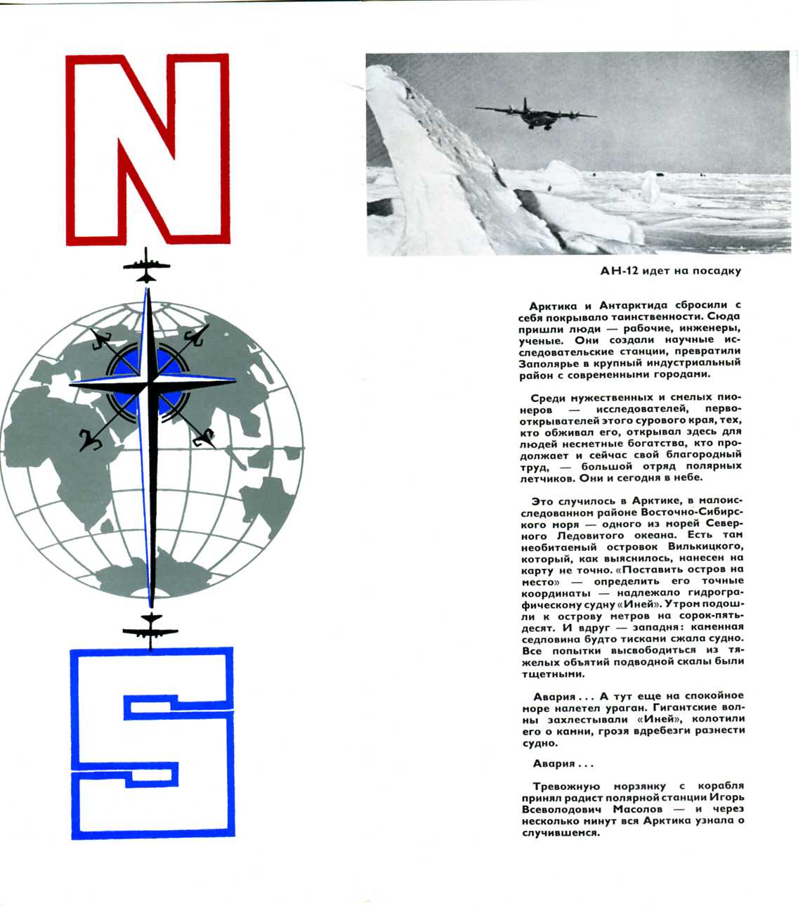 Неузнаваено изменилось Заполярье за время, прошедшее с октября 1917 года. Здесь выросло много благоустроенных городов и населенных пунктов. Прошлое, настоящее и будущее Норильска и Певека, Тикси и Анадыря, Диксона и Магадана, как и многих других городов и поселков, связано с Полярной авиацией Аэрофлота. Сейчас за Полярным кругом проложены десятки воздушных дорог. Заполярье связано с Москвой и рядом других крупных промышленных и культурных центров Советского Союза прямым воздушным сообщением. Северная воздушная магистраль  — одна из наиболее протяженных в мире  — соединяет Норильск, Магадан, Тикси, Черский и Анадырь со столицей нашей Родины. Быстроходный комфортабельный ИЛ-18 в считанные часы доставит Вас из Москвы в любой из этих населенных пунктов.