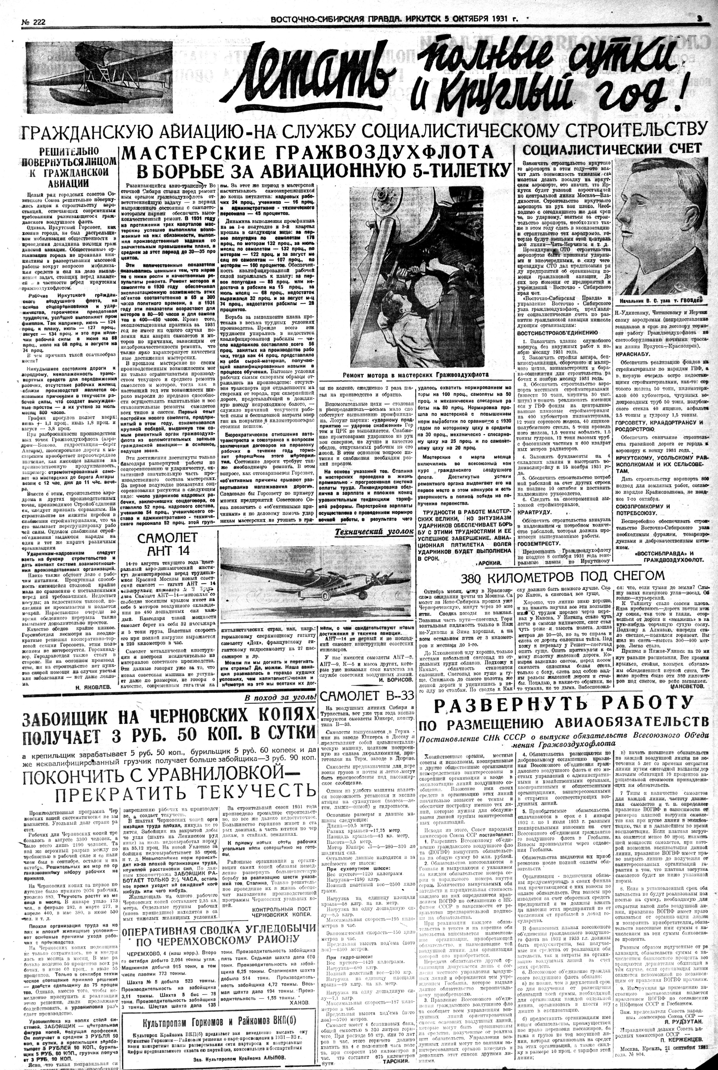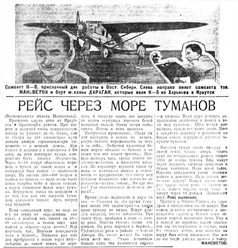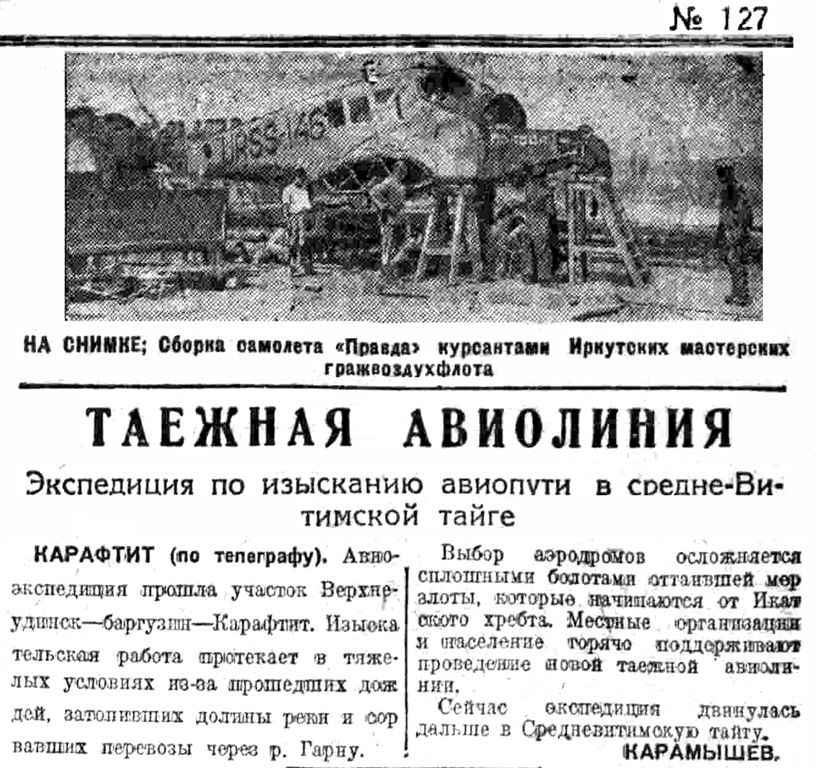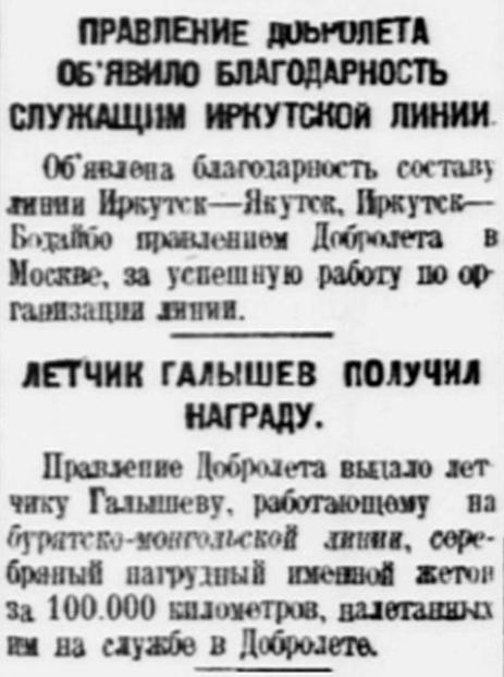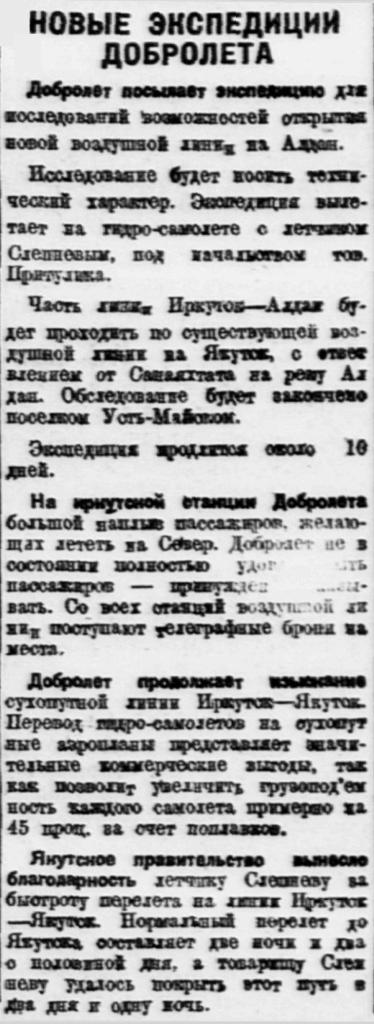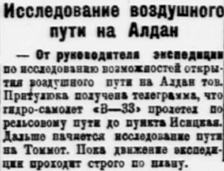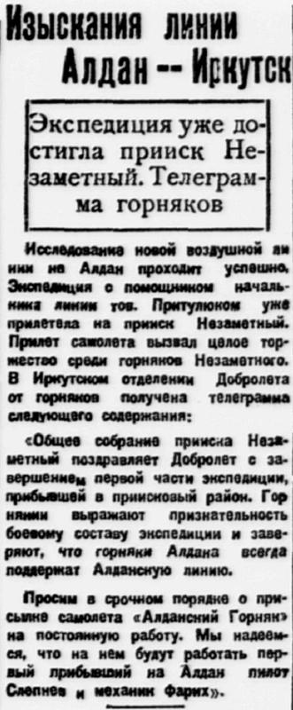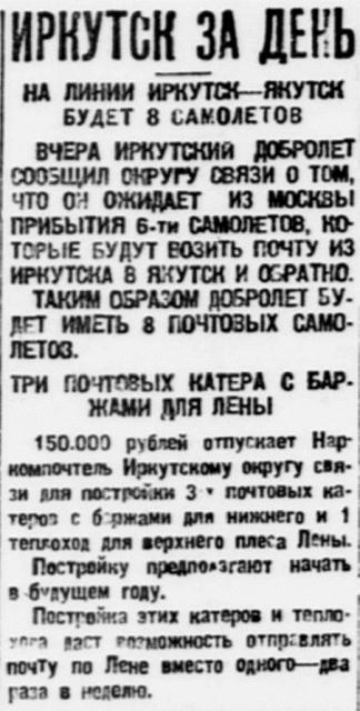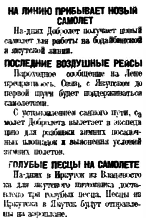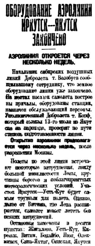 Власть труда, 1928, № 167 (2572), 20 июля.ОБОРУДОВАНИЕ АЭРОЛИНИИ ИРКУТСК - ЯКУТСК ЗАКОНЧЕНОАЭРОЛИНИЯ ОТКРОЕТСЯ ЧЕРЕЗ НЕСКОЛЬКО НЕДЕЛЬ.Начальник сибирских воздушных линий Добролета т.