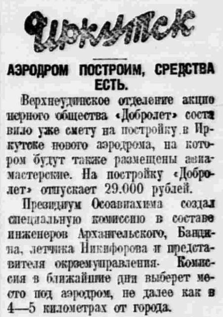 Иркутские мастерские Добролета переоборудуются для обслуживания самолетов бурятской, якутской, бодайбинской и части сибирских линий. Нa переоборудование мастерских отпущено до ста тысяч рублей. Более 400 тысяч рублей ассигновано на постройку ангаров и аэровокзала.