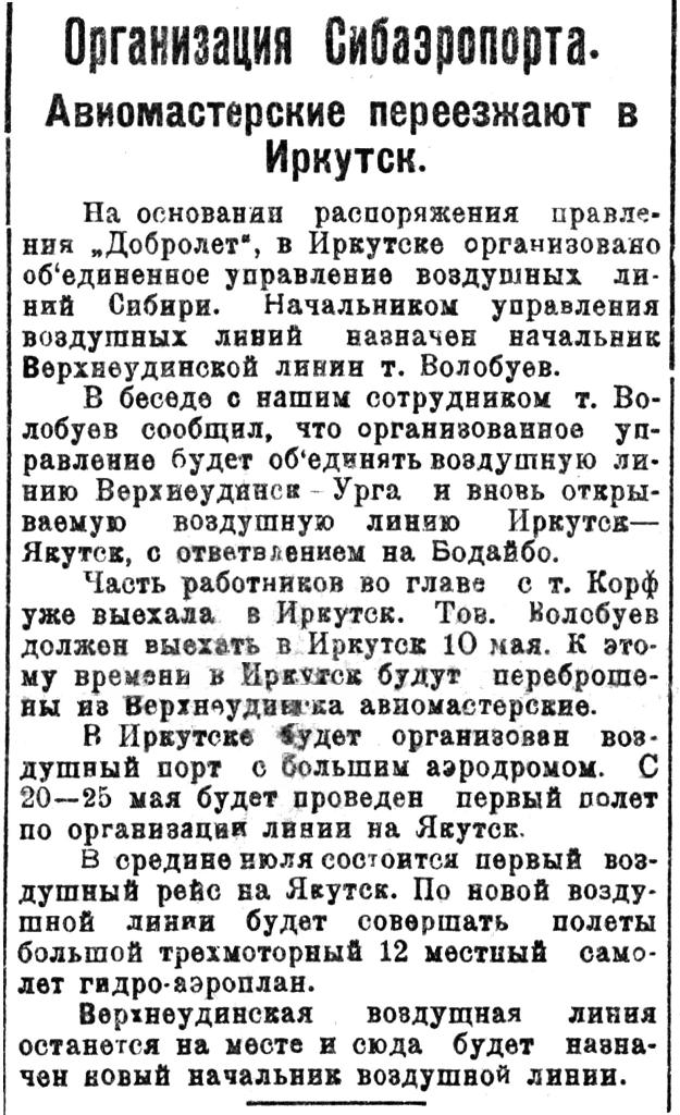 БМП, №106, 1928 г., 11 мая.Организация Сибазропорта.Авиомастерские переезжают в Иркутск.На основании распоряжения правления „Добролет", в Иркутске организовано объединенное управление воздушных линий Сибири. Начальником управления воздушных линий назначен начальник Верхнеудинской линии т.