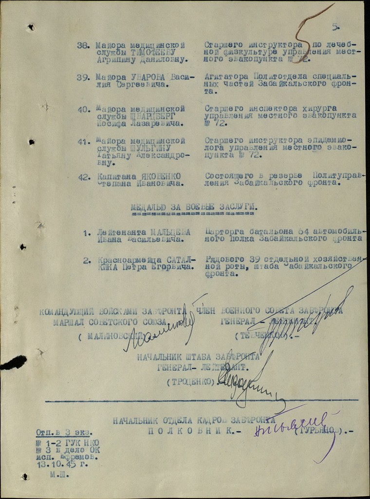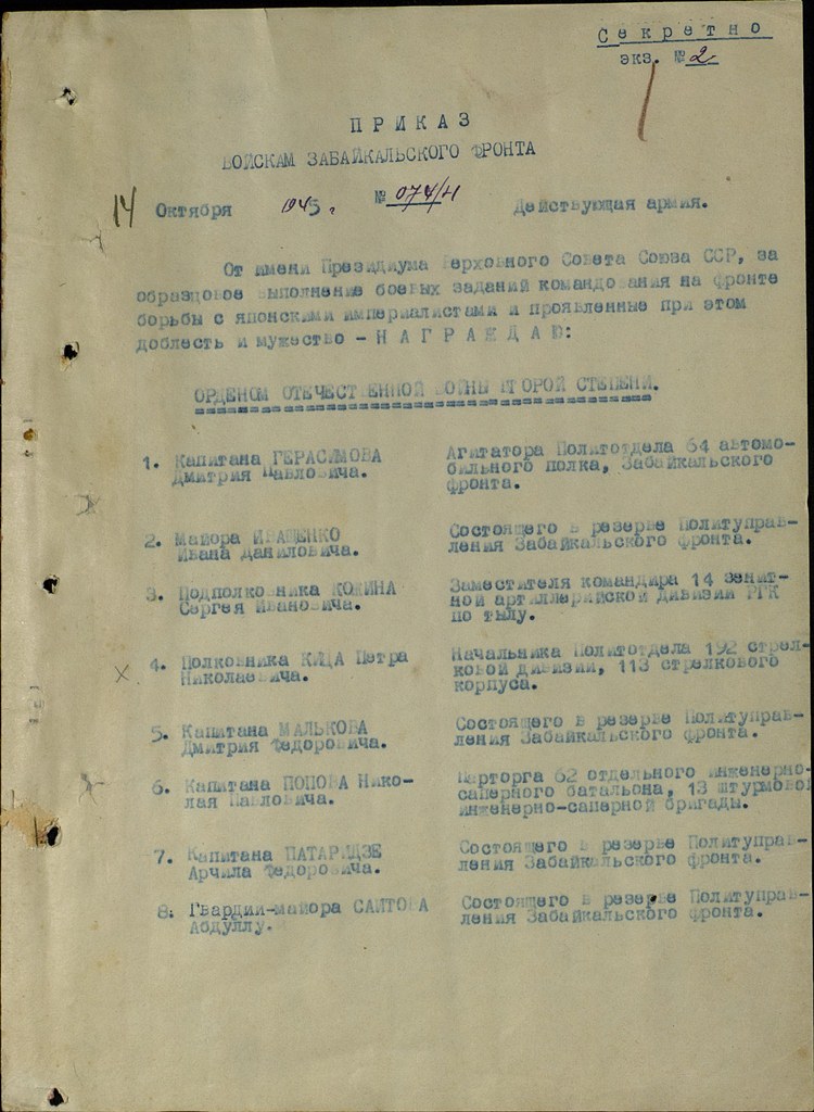 Фронтовой приказ № 74/н от: 14.10.1945 ВС Забайкальского фронта