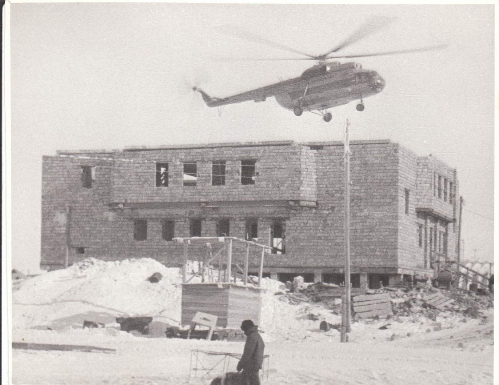 Это Басов Леонид Кузьмич вертолетом на подвеске укладывает плиты перекрытия будущего аэровокзала. Найдено в "Одноклассниках" в нескольких местах, автора установить трудно.