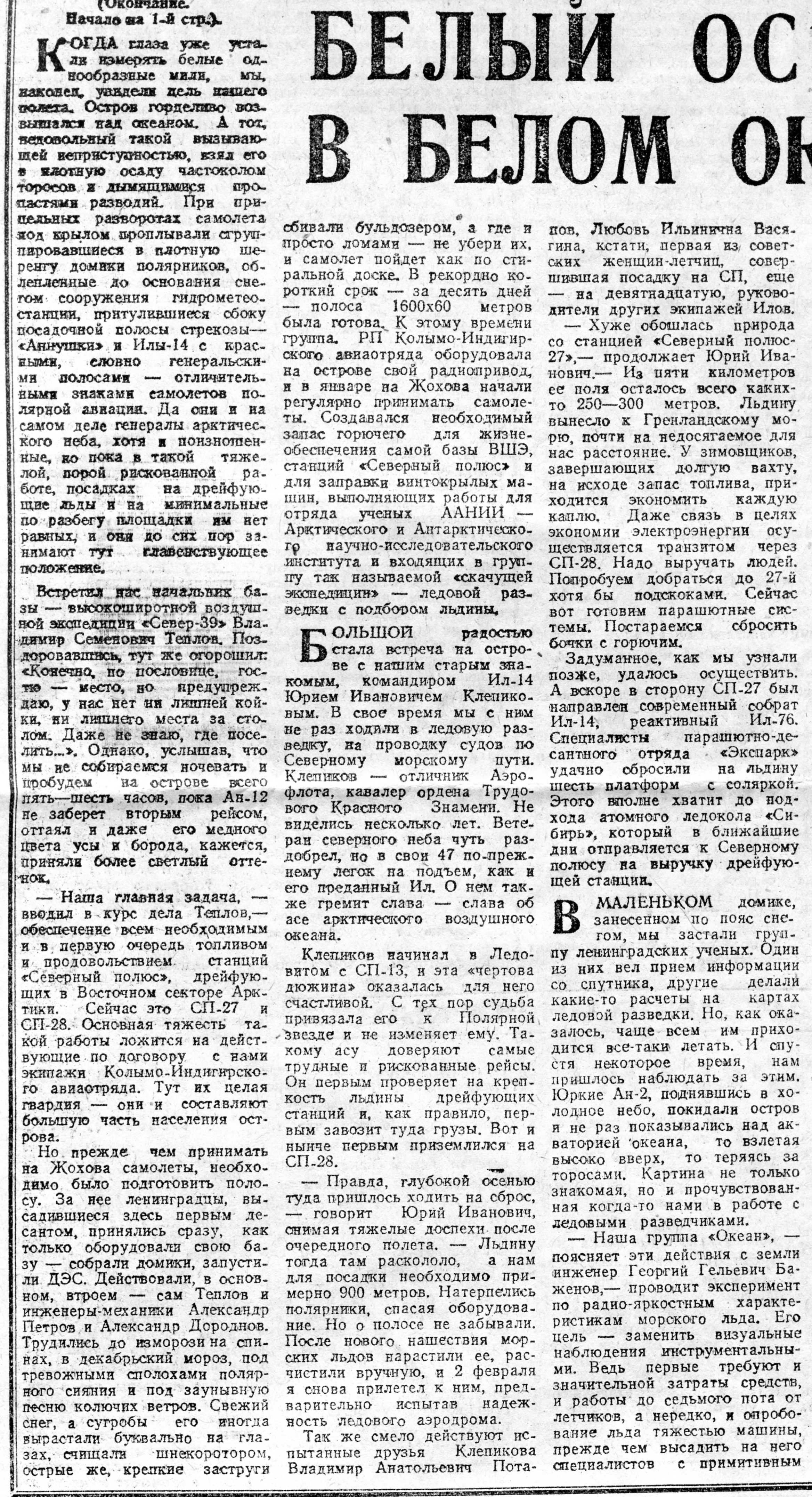 Так же смело действуют испытанные друзья Клепикова Владимир Анатольевич Потапов, Любовь Ильинична Васягина, кстати, первая из, советских женщин-летчиц, совершившая посадку на СП, еще — на девятнадцатую, руководители других экипажей Илов.