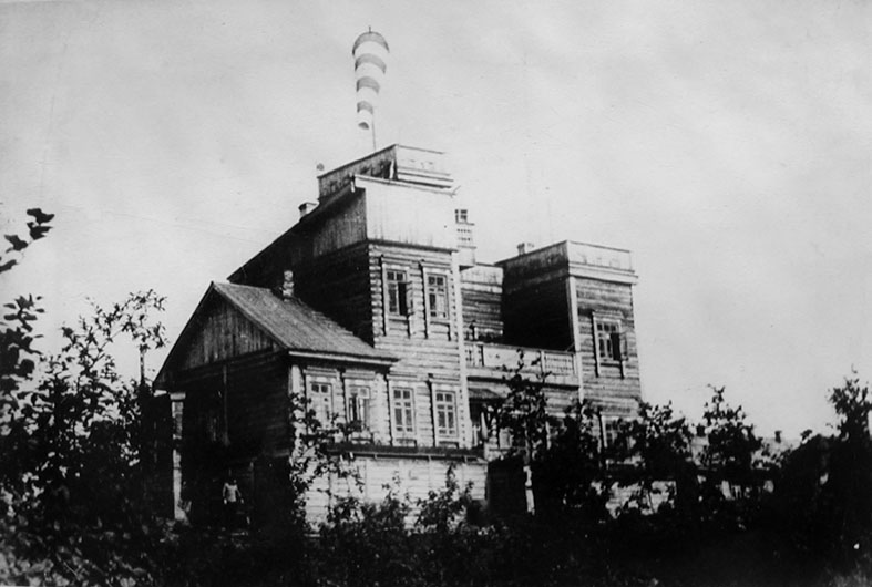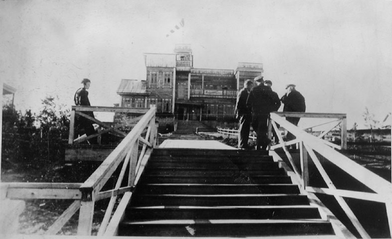 Это здание проектировал московский архитектор-конструктивист И.И. Леонидов в 1931 г. (теперь его как гения, опередившего лет на 100 проектирование, знают все архитекторы мира и много у него заимствовали и заимствуют). Здание простояло до 1988 г., снесено, остался лишь врытый фундамент из лиственничного бруса. Где то на форуме проходило фото с датой-47й год, но похоже это другое место. На панорамных снимках гидропорта ниже, хорошо просматривается характерная лестница: