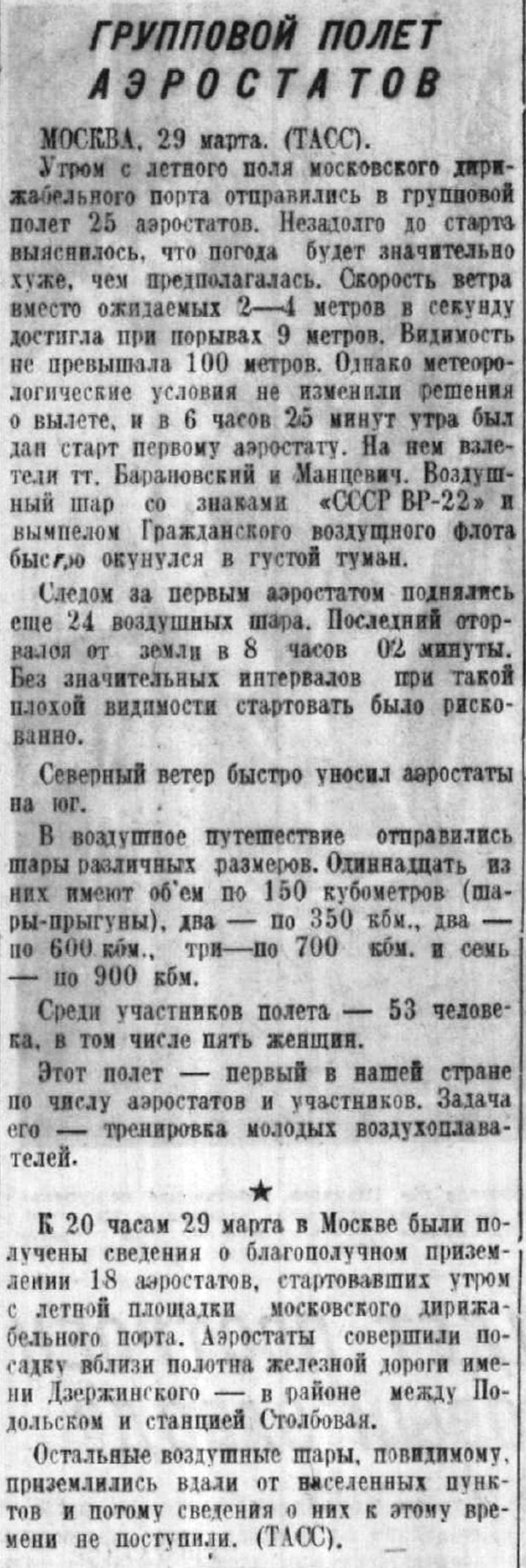 Утром с летного поля московского дирижабельного порта отправились в групповой полет 25 аэростатов. Незадолго до старта выяснилось, что погода будет значительно хуже, чем предполагалась. Скорость ветра вместо ожидаемых 2—4 метров в секунду достигла при порывах 9 метров. Видимость не превышала 100 метров. Однако метеорологические условия не изменили решения о вылете, и в 6 часов 26 минут утра был дан старт первому аэростату. На нем вылетели тт. Барановский и Манцевич. Воздушный шар со знаками "СССР ВР-22" и вымпелом Гражданского воздушного флота быстро окунулся в густой туман. Следом за первым аэростатом поднялись еще 24 воздушных шара. Последний оторвался от земли в 8 часов 02 минуты. Без значительных интервалов при такой плохой видимости стартовать было рискованно. Северный ветер быстро уносил аэростаты на юг. В воздушное путешествие отправились шары различных размеров. Одиннадцать из них имеют объем по 150 кубометров (шары-прыгуны), два — по 350 кбм., два — по 600 кбм., три — по 700 кбм. и семь — по 900 кбм. Среди участников полета — 53 человека, в том числе пять женщин.