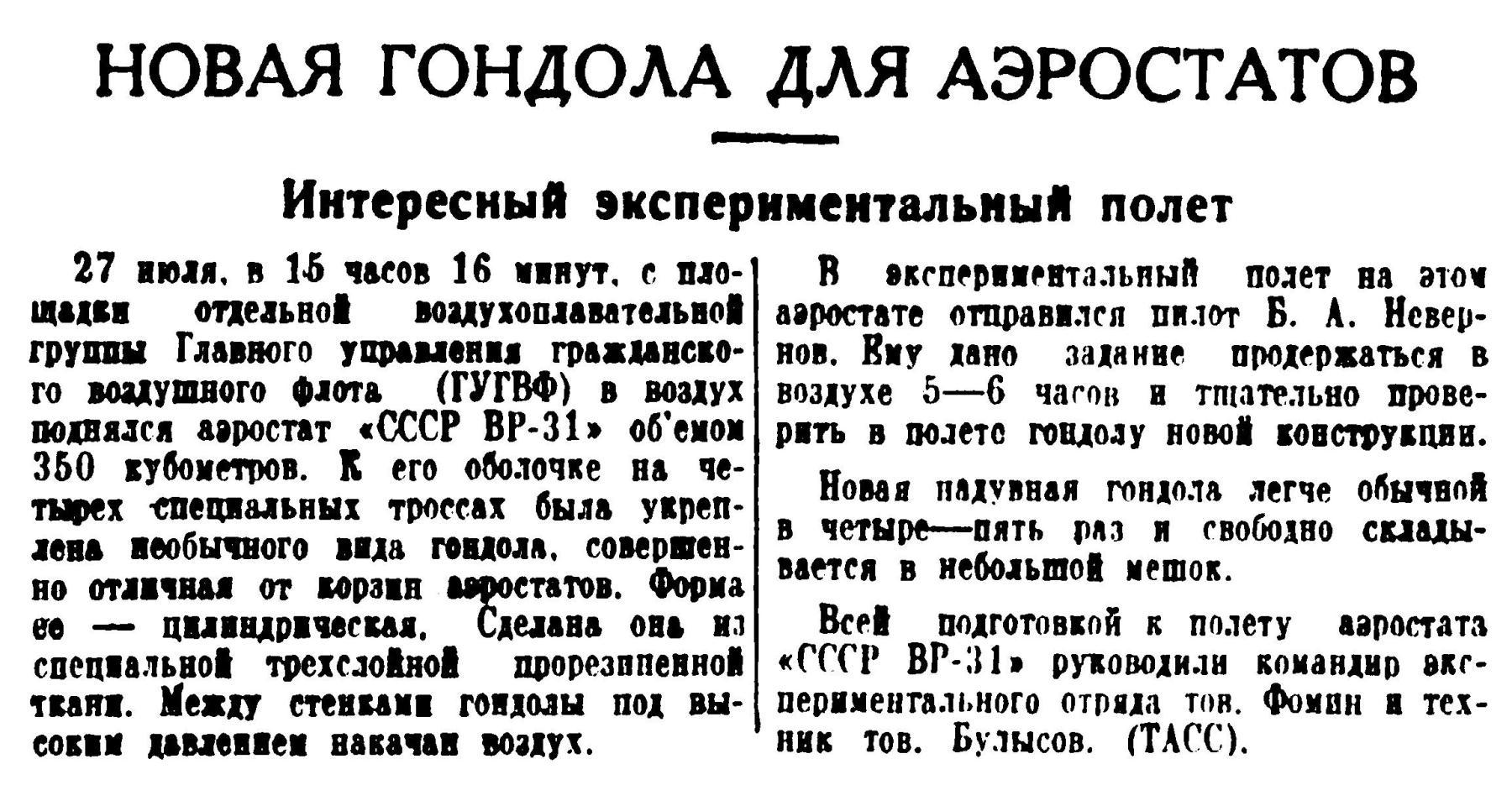 В экспериментальный полет на этом аэростате отправился пилот Б. А. Невернов. Ему дано задание продержаться в воздухе 5—6 часов и тщательно проверить в полете гондолу новой конструкции. Новая надувная гондола легче обычной в четыре—пять раз и свободно складывается в небольшой мешок. Всей подготовкой к полету аэростата «СССР ВР-31» руководили командир экспериментального отряда тов. Фомин и техник тов. Булысов. (ТАСС).