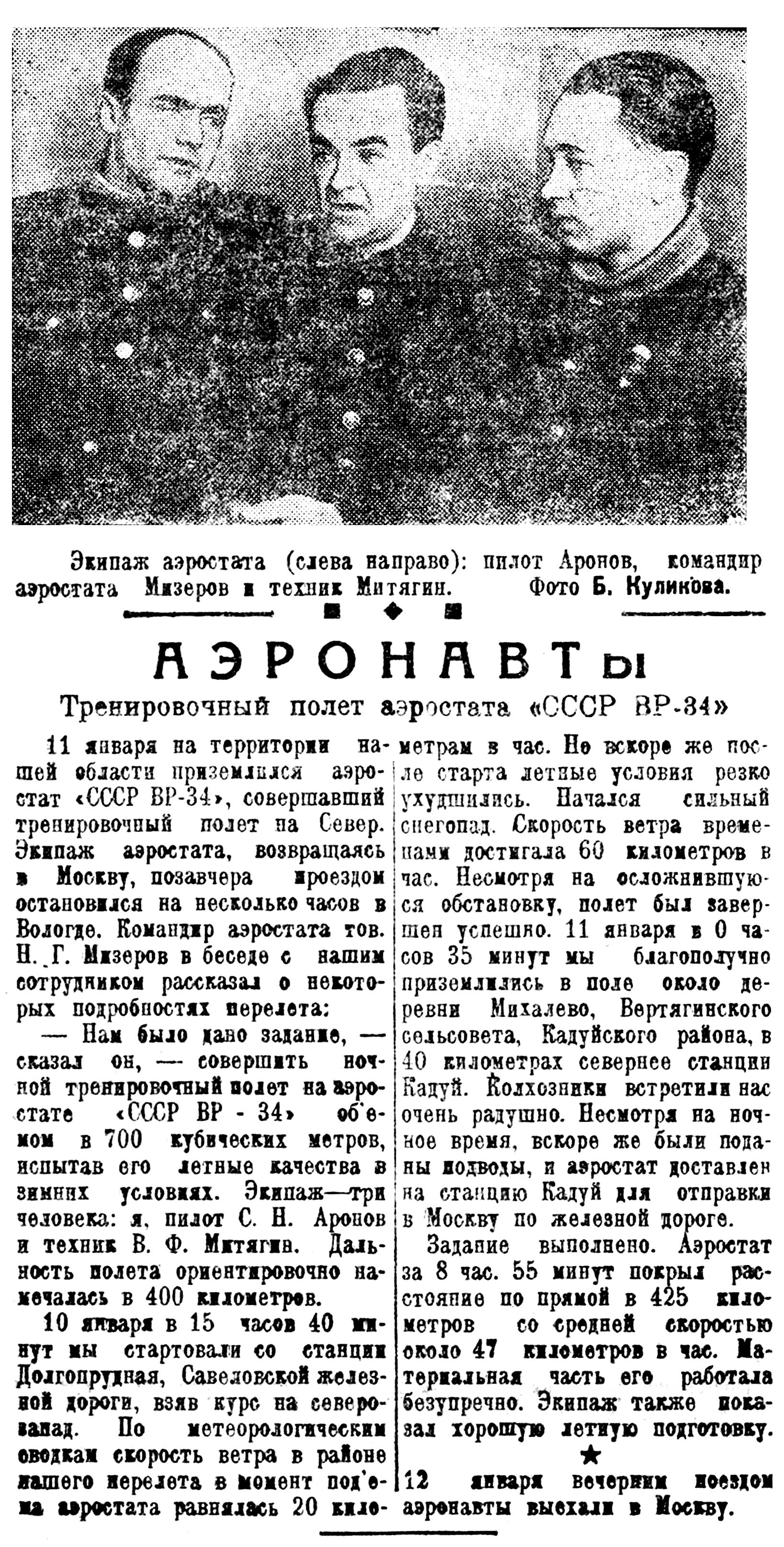 11 января на территории нашей области приземлился аэростат «СССР ВР-34», совершавший тренировочный полет на Север. Экипаж аэростата, возвращаясь в Москву, позавчера проездом остановился на несколько часов в Вологде. Командир аэростата тов. Н. Г. Мизеров в беседе с вашим сотрудником рассказал о некоторых подробностях перелета;
